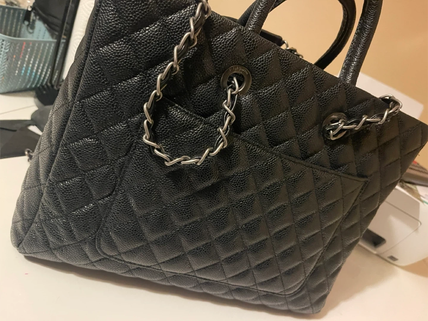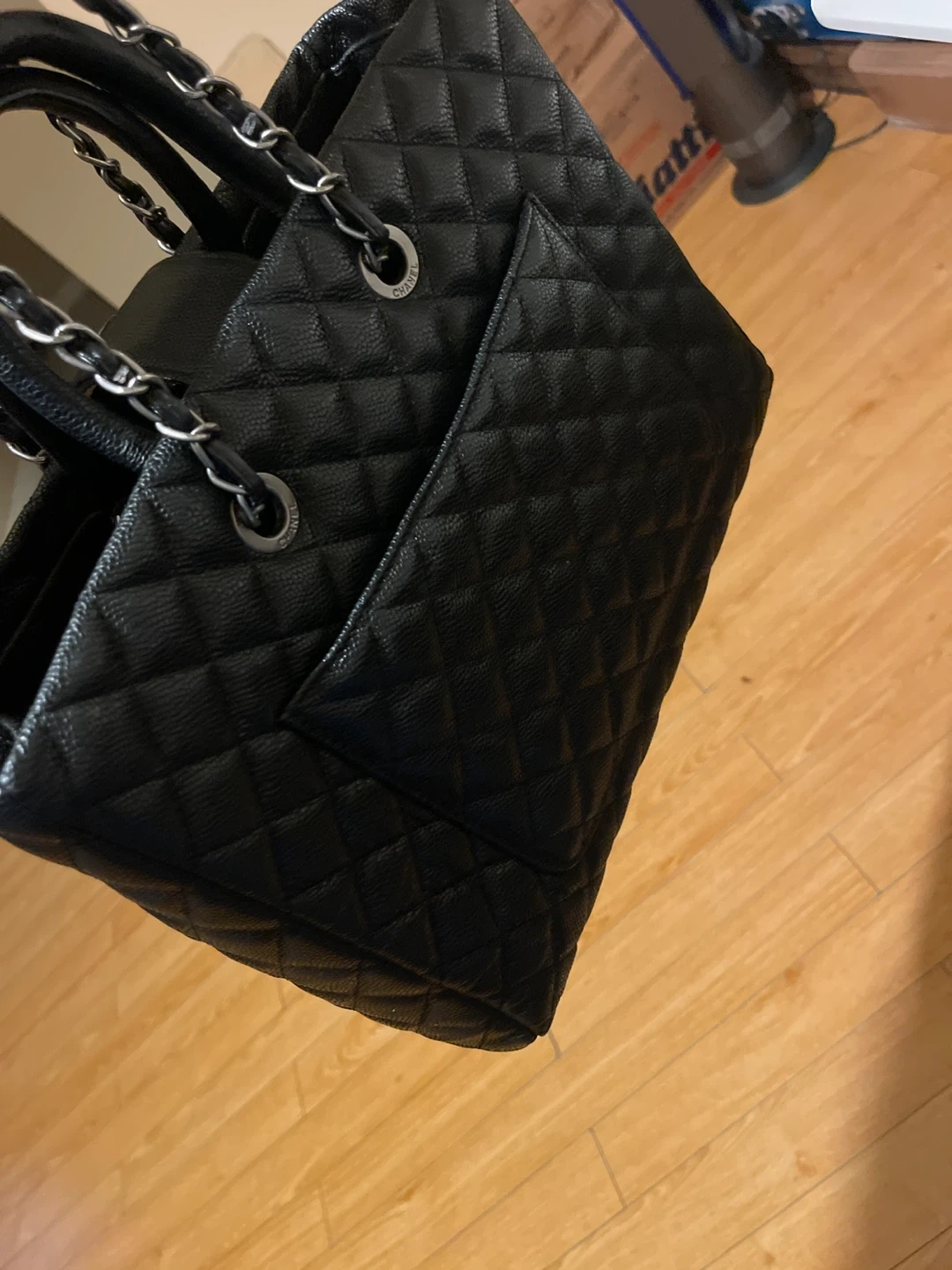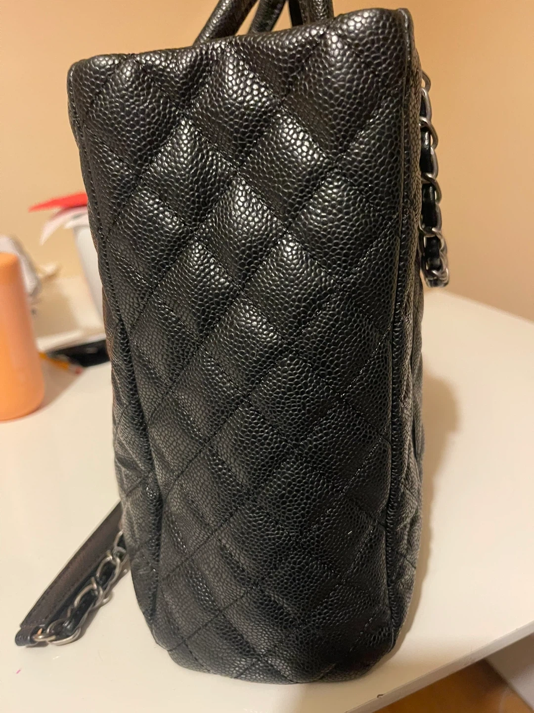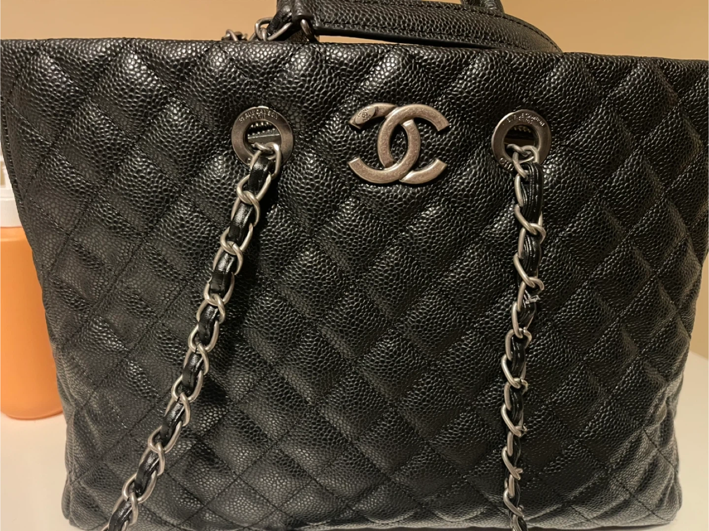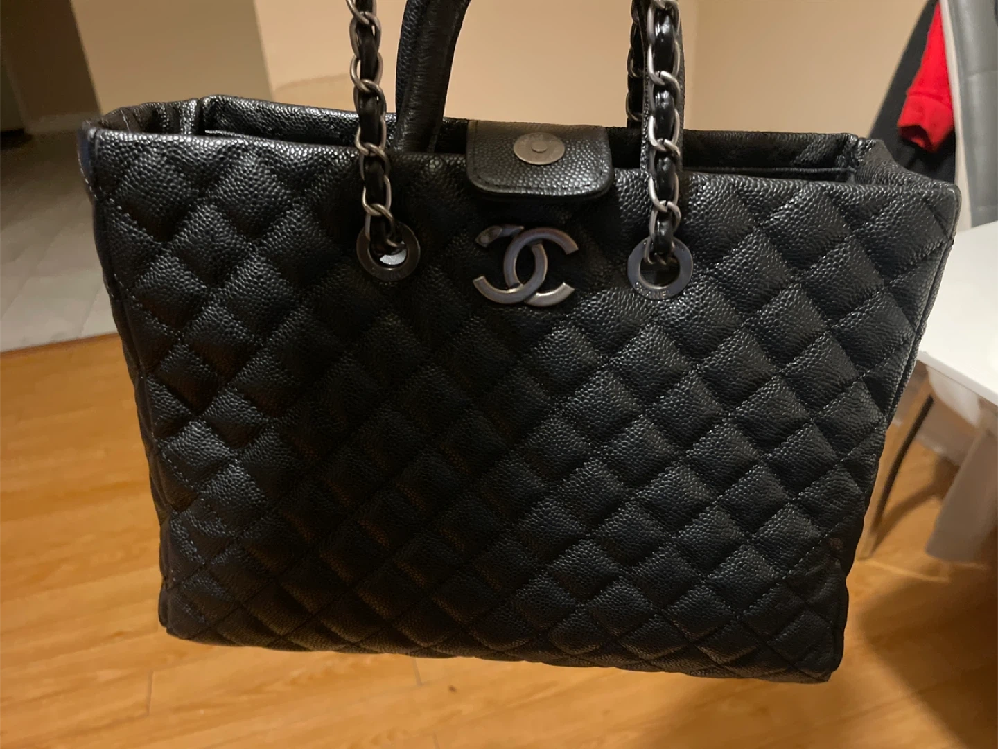 10This is used almost clean Chanel tote bag, perfect for everyday use with its spacious interior and signature Chanel elegance. The classic black quilted leather and chain detailing add a touch of luxury to any outfit. While it's in used condition, it has been well cared for. There are no visible markings that impacts the bag's integrity. * Brand: Chanel * Style: Tote * Colour: Black * Material: Leather