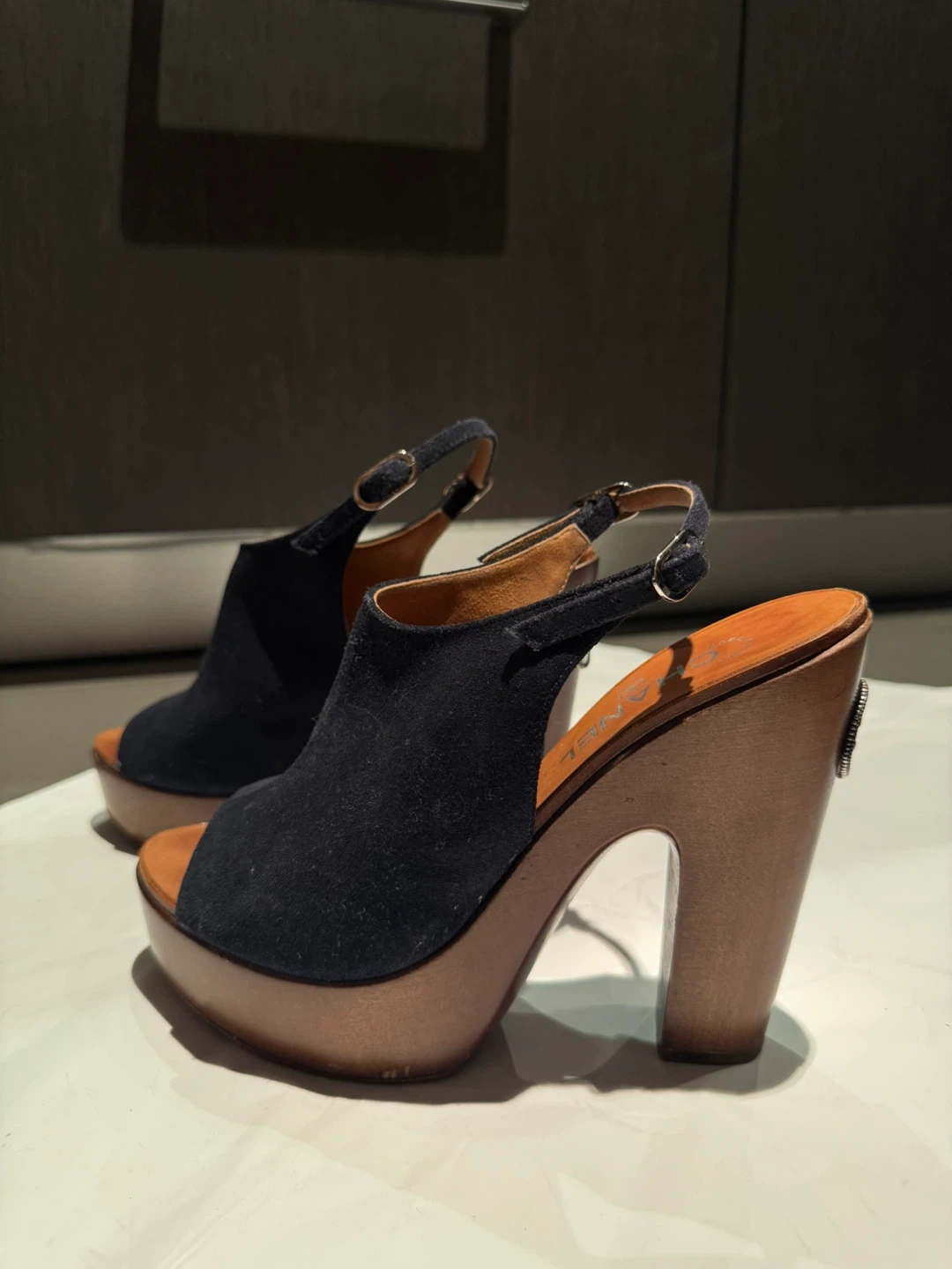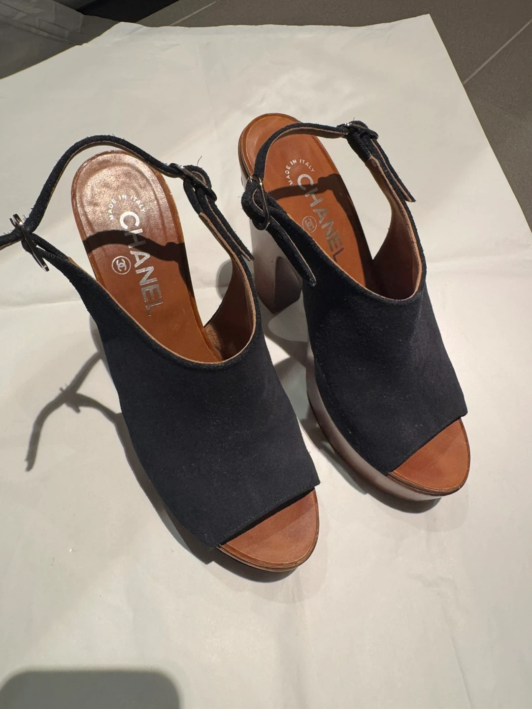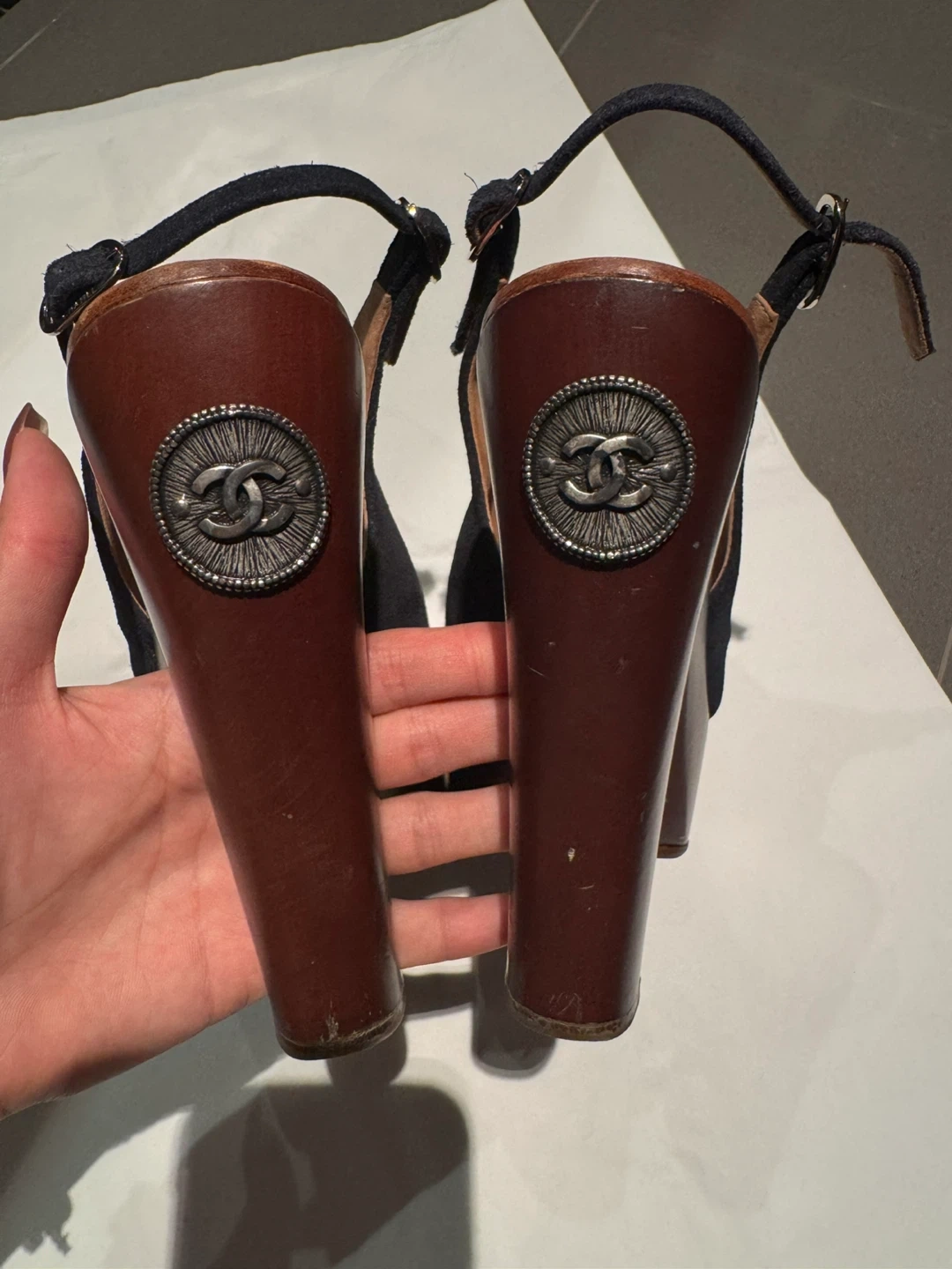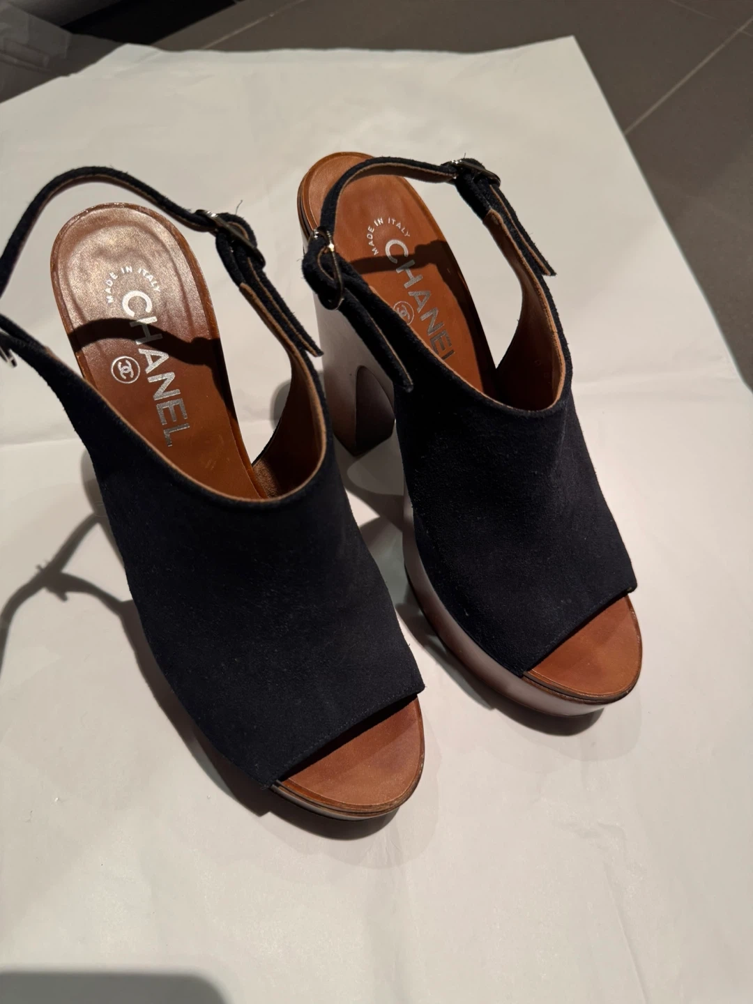 60These Chanel platform sandals are a stylish addition to any wardrobe! They feature a black suede upper and a wooden platform heel. Perfect for adding a touch of elegance to your look