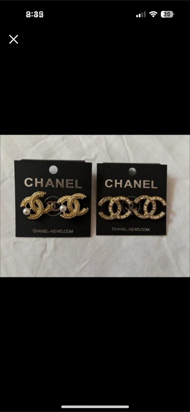 Selling a pair of Chanel earrings featuring the iconic CC logo. One pair has a pearl accent, and the other has a rhinestone accent. They are in great condition!