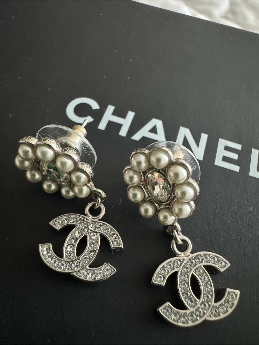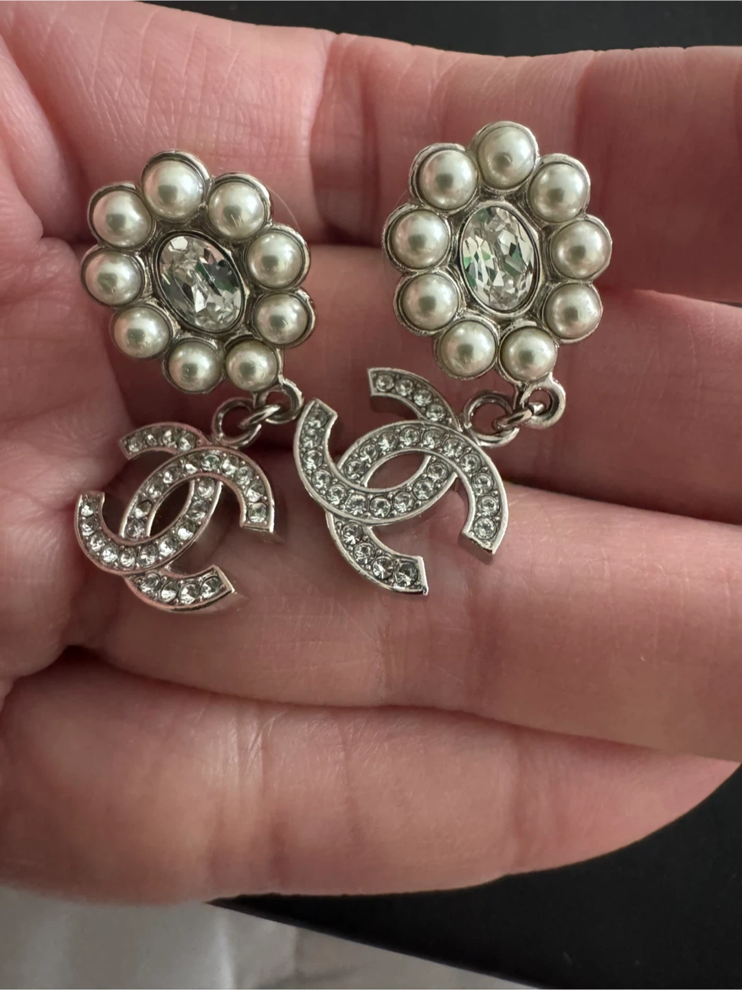 These are beautiful Chanel earrings featuring a floral design with pearls and crystals. They have the classic Chanel logo dangling below. Perfect for adding a touch of elegance to any outfit!