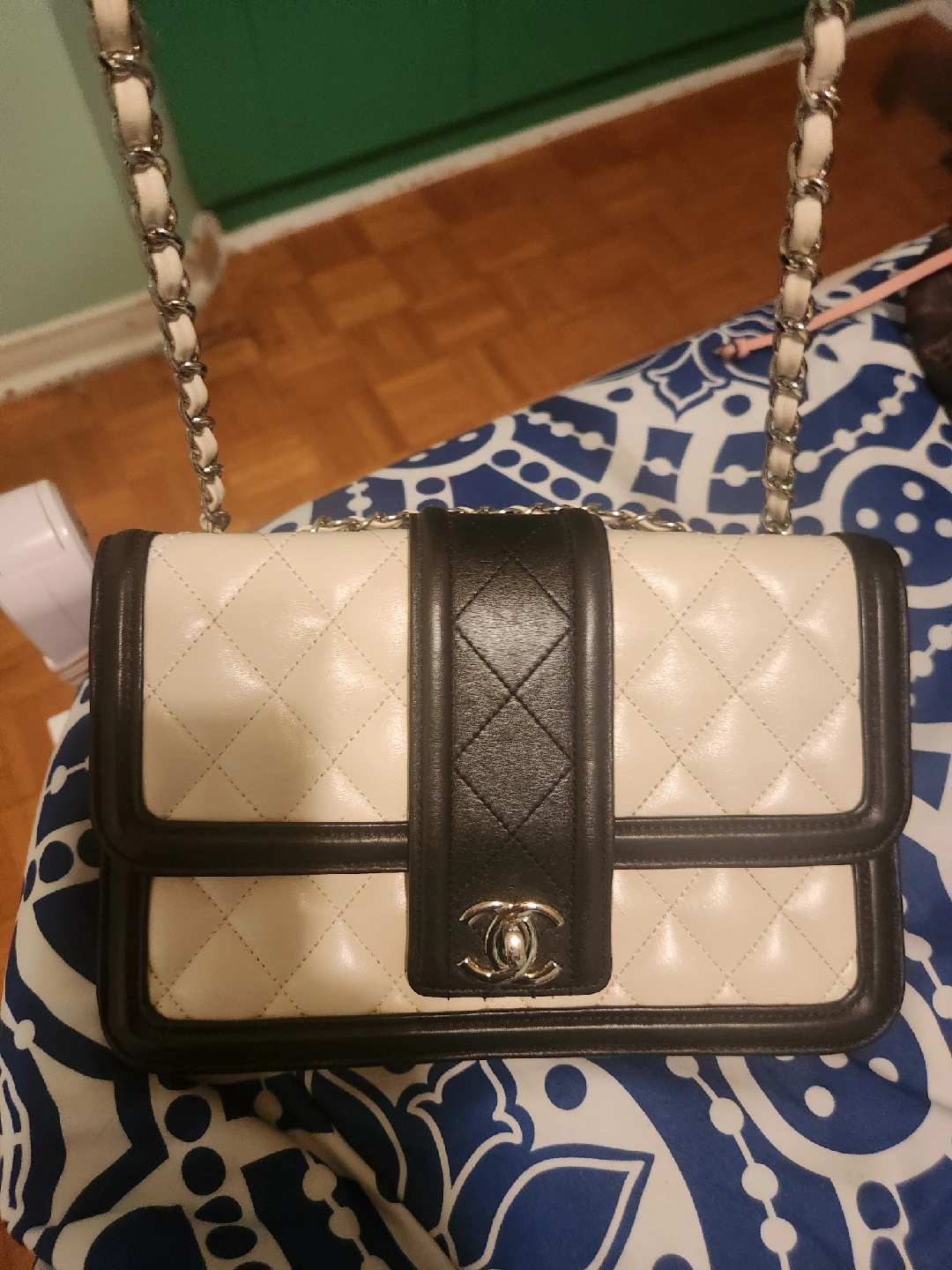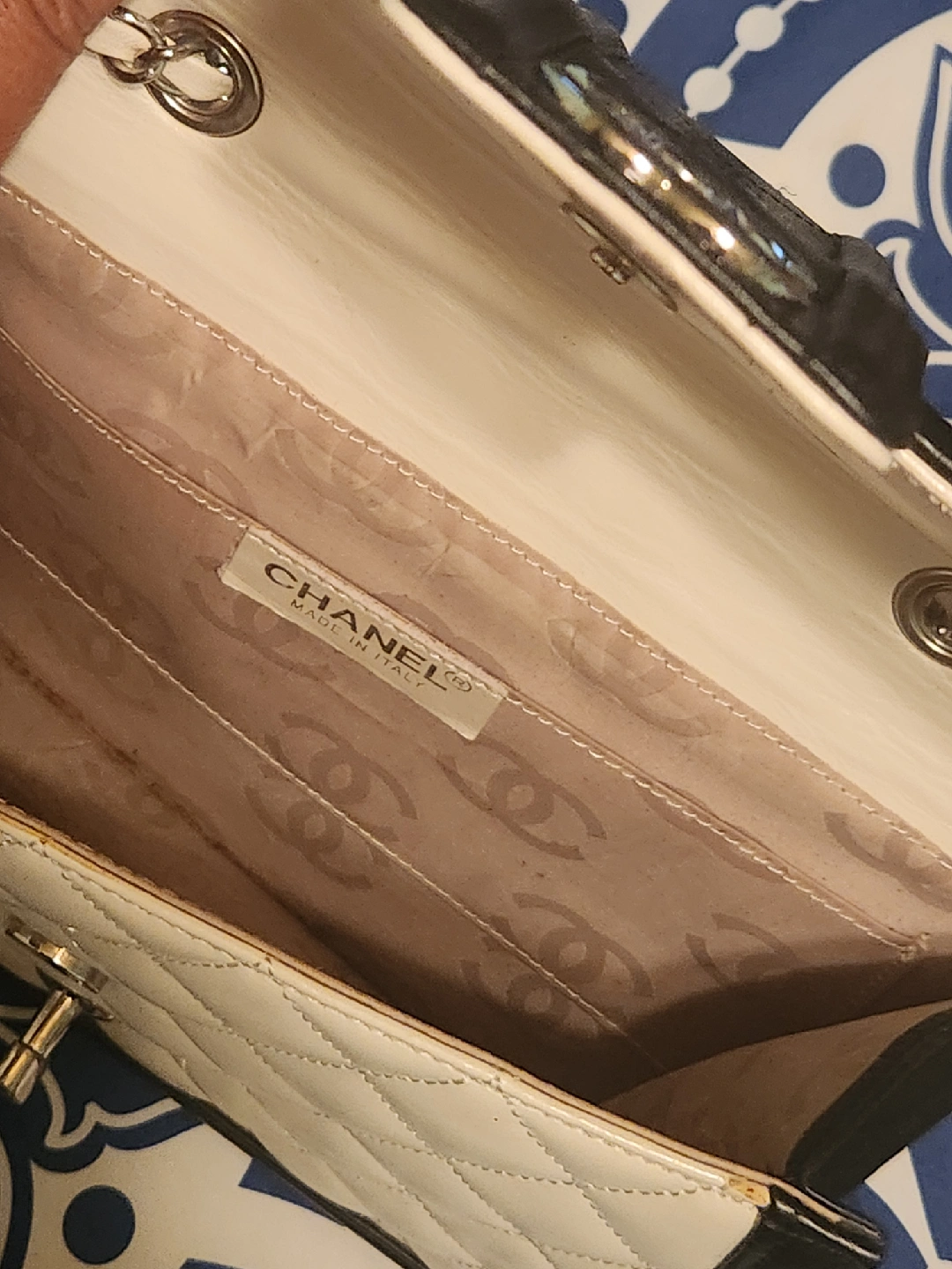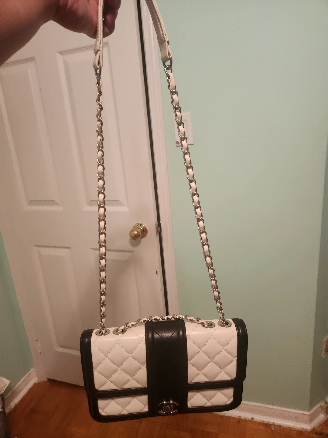 Selling a Chanel handbag in a stylish black and white colour combination. It's made in Italy and has a classic design. There are some signs of use inside the bag, as shown in the pictures.