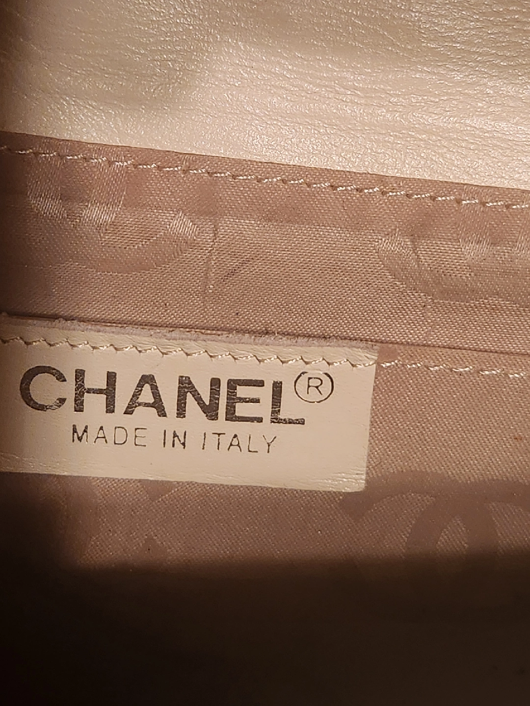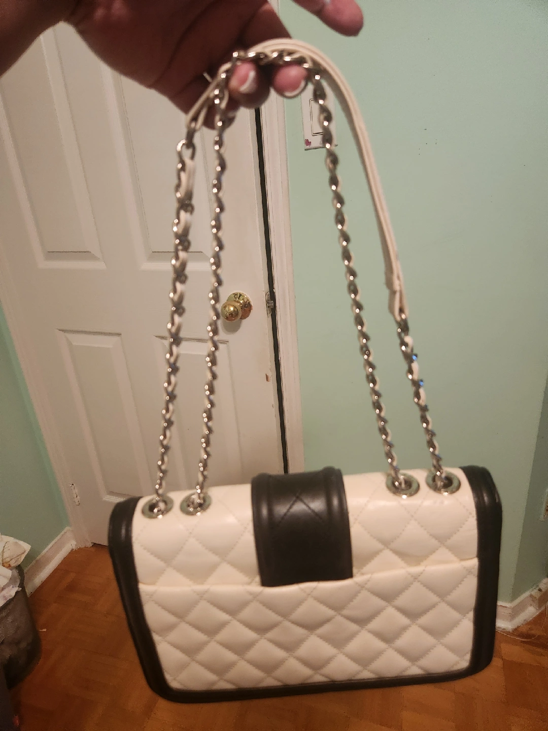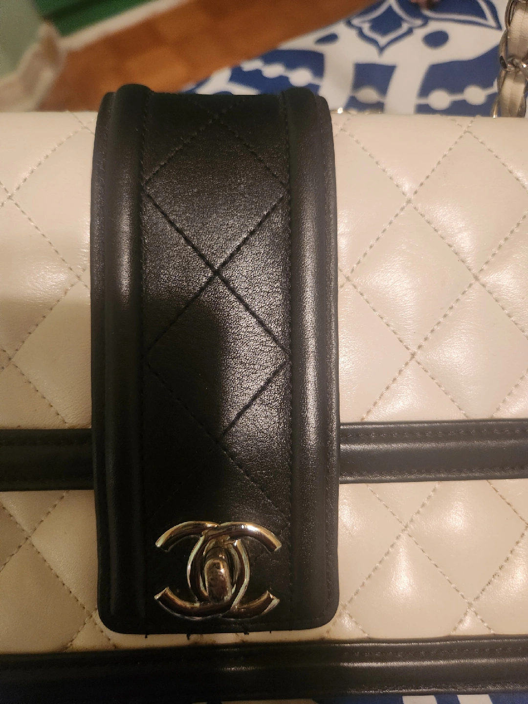 Selling a Chanel handbag in a stylish black and white colour combination. It's made in Italy and has a classic design. There are some signs of use inside the bag, as shown in the pictures.
