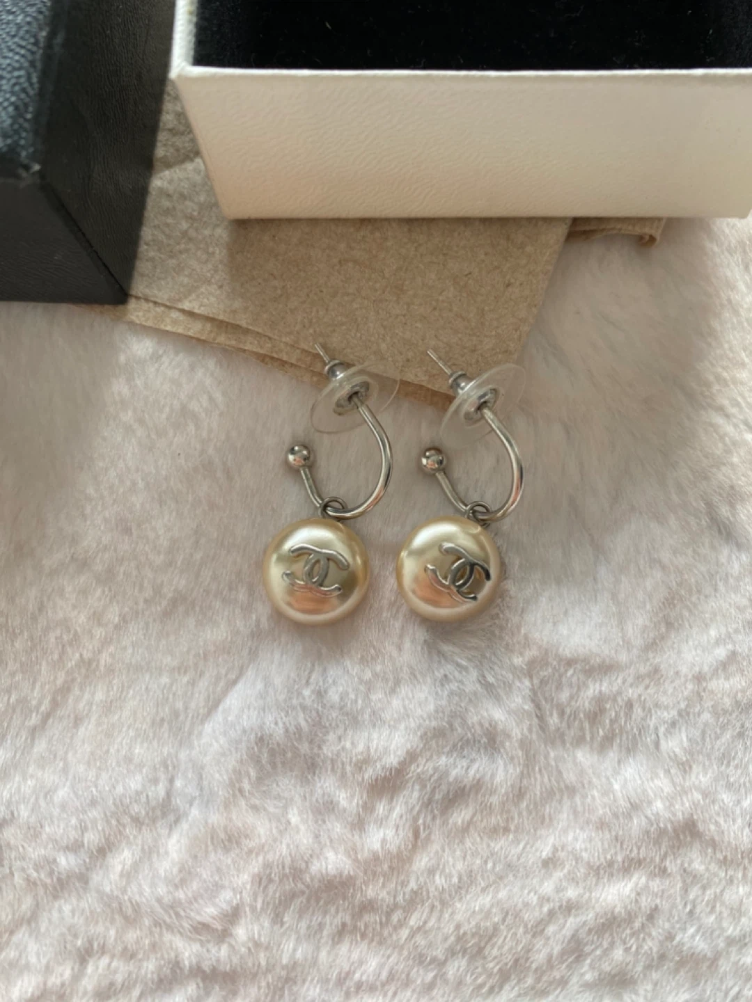Authentic with box. Off white cream color Pearl with silver hardware. Very elegant. Light scratches on hardware.
