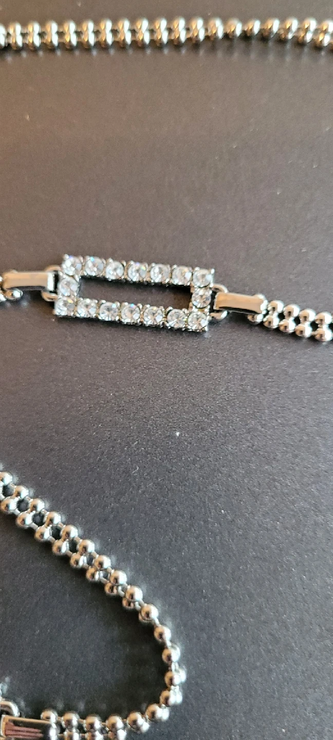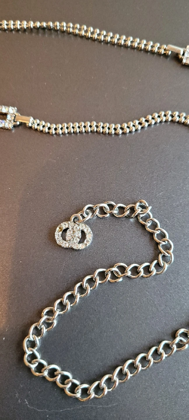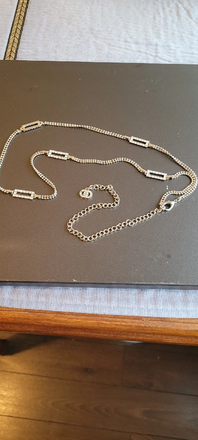 10This is a Chanel necklace/belt in a silver tone with crystal detailing. The necklace features the iconic Chanel logo and rectangular crystal embellishments along the chain. It's a beautiful piece to add a touch of elegance to any outfit! Total length 36 "