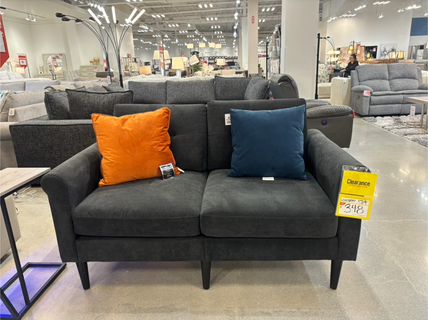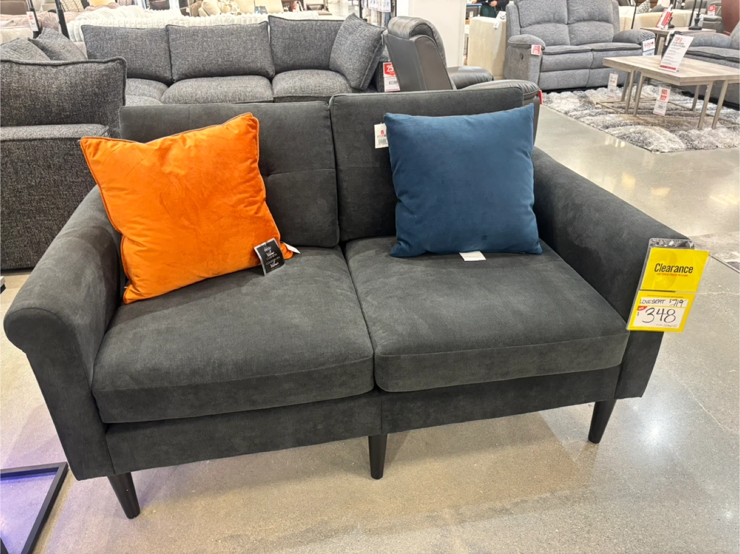 Selling a charcoal-coloured loveseat in excellent condition! It's a stylish and comfy addition to any living space. The loveseat comes with two accent pillows, one orange and one blue. Originally priced at $579 and on clearance for $348!