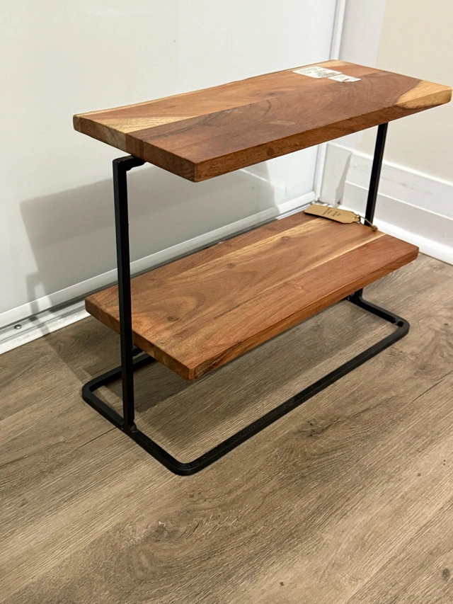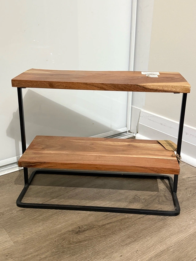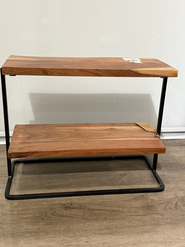 Sturdy metal frame. Two-tiered design. Elegant wood shelves. Compact size fits any space. Size: height is 11 inches, length 14 inches & width 6 inches
