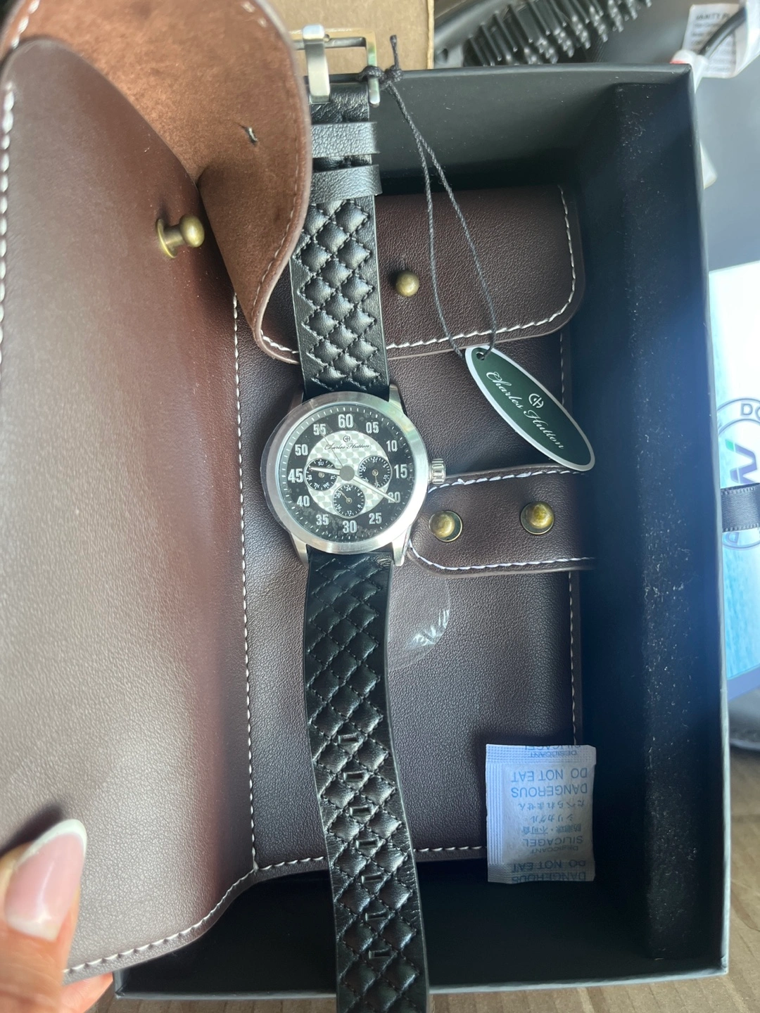 Selling a Charles Hutton watch. It comes with its original box. The watch features a black quilted leather strap and a silver-tone case. Retails for $225