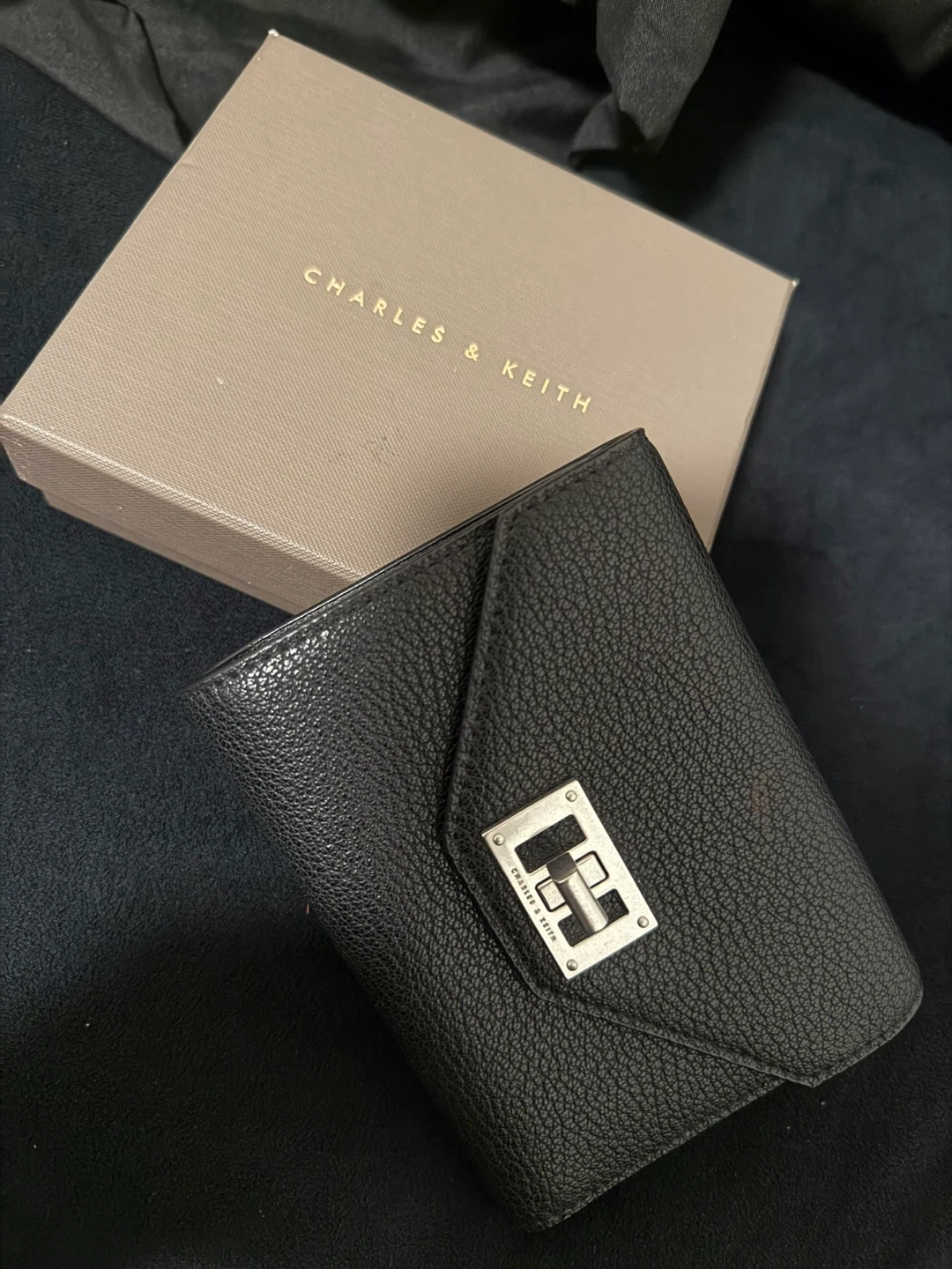 Selling a Charles & Keith wallet in black. It's in great condition and comes with the original box! It has a unique textured design and a secure closure.