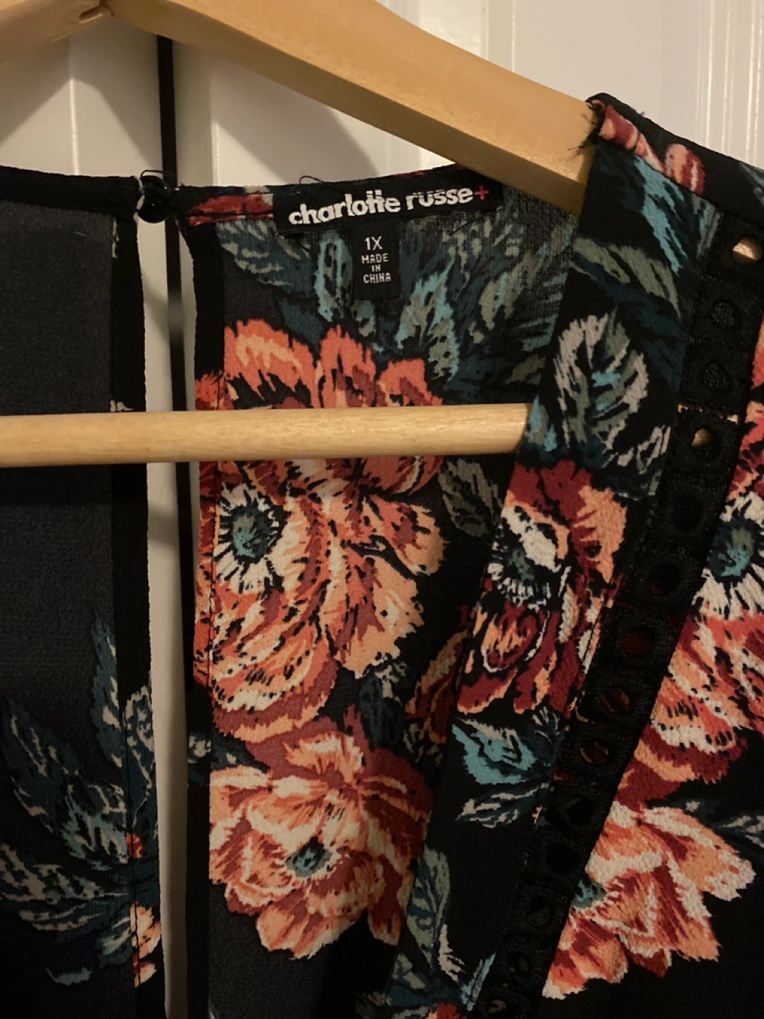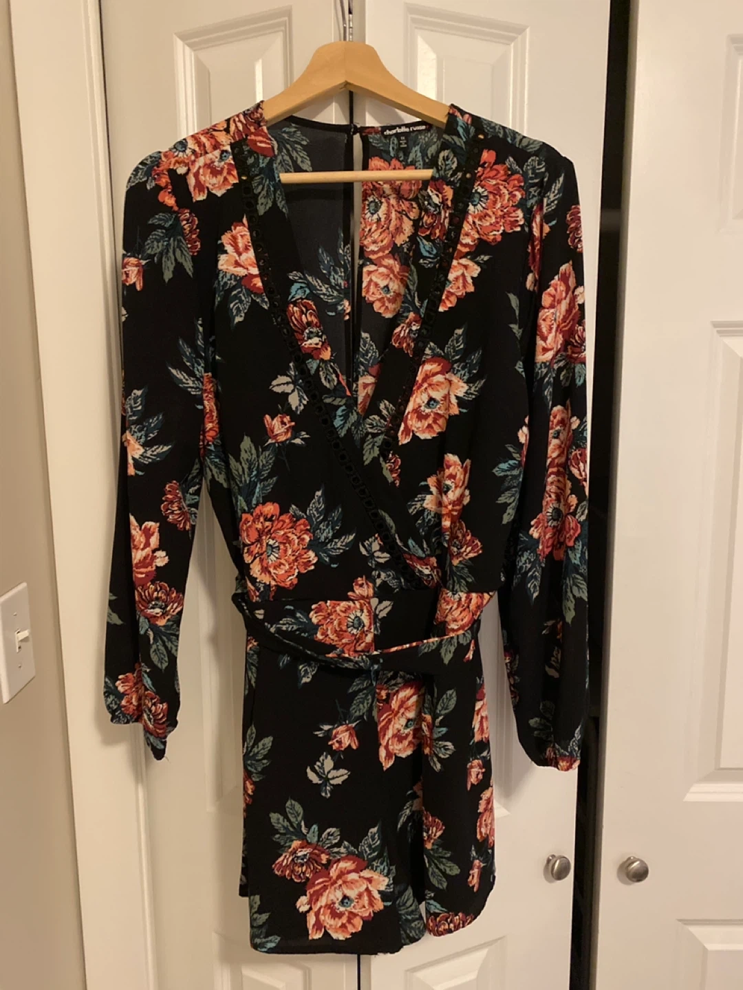 23This is a Charlotte Russe floral romper in size 1X! It features a beautiful floral pattern on a black background. Perfect for a night out or a casual day.