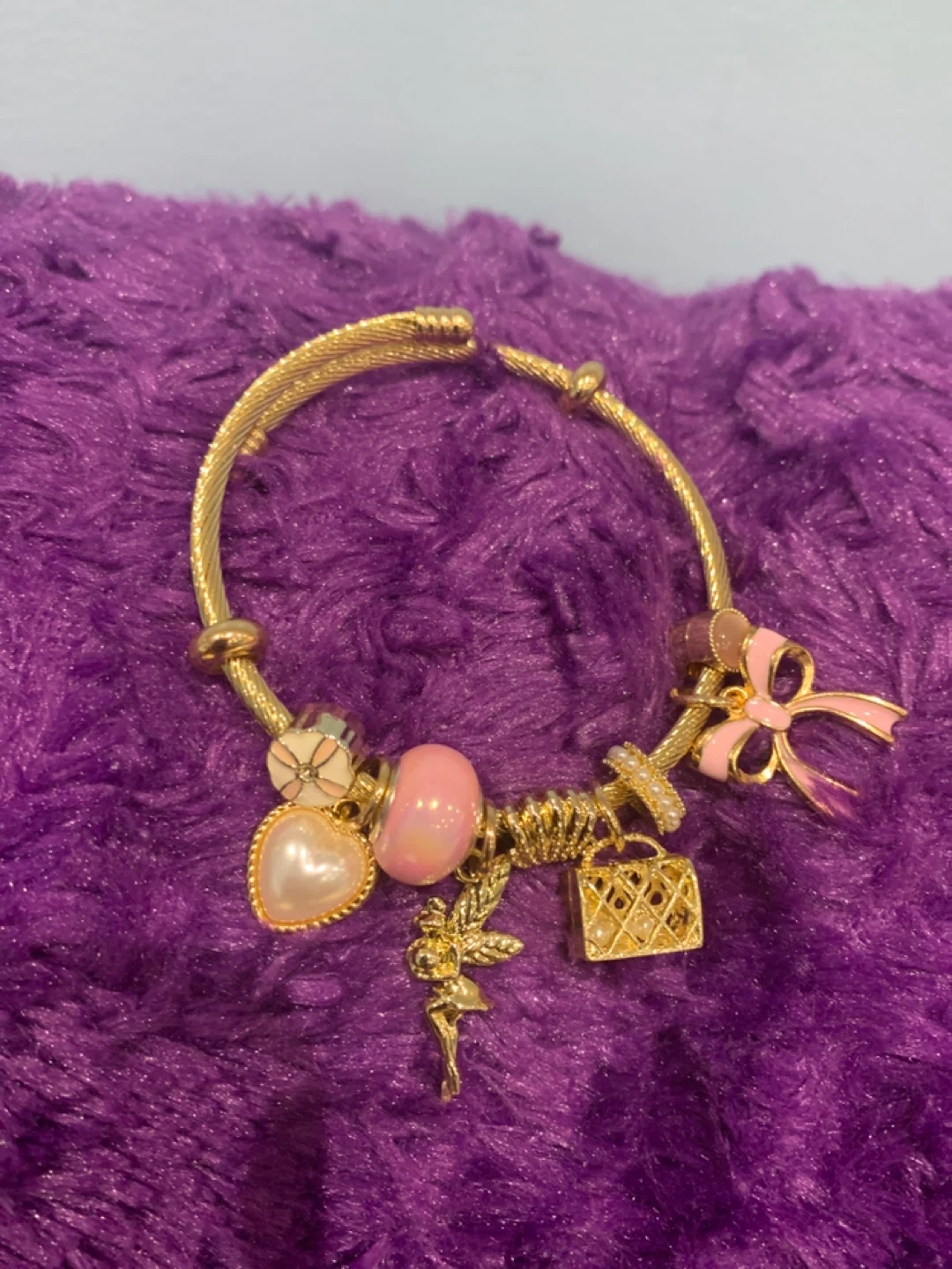 1000+Selling a cute charm bracelet in a gold tone! It features a variety of charms including a heart, a fairy, a bow, and a handbag charm. Perfect for adding a bit of sparkle to your day