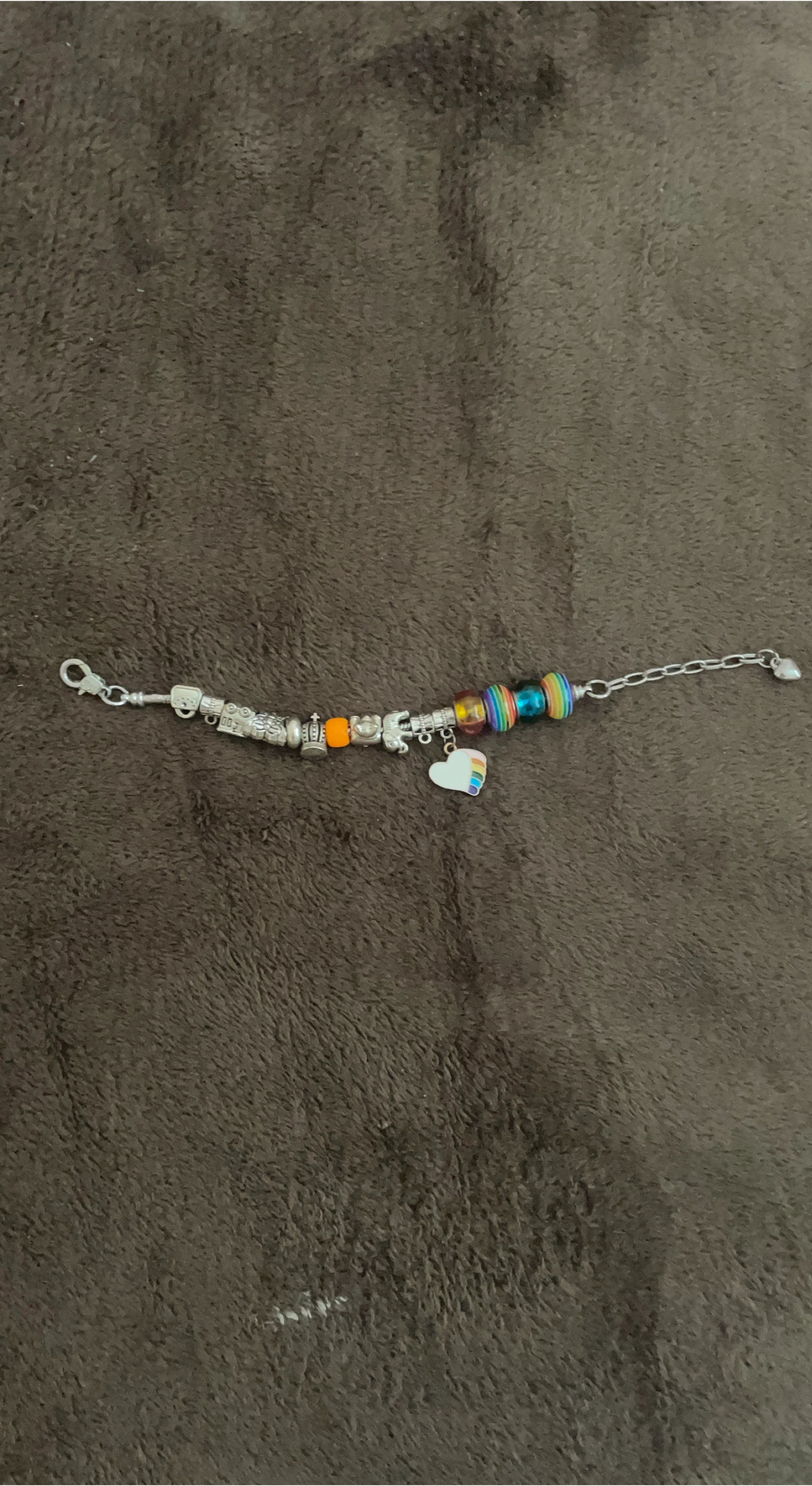 Cute charm bracelet with a variety of beads and charms. It features a rainbow heart charm and other fun designs. Perfect for adding a touch of colour to any outfit!