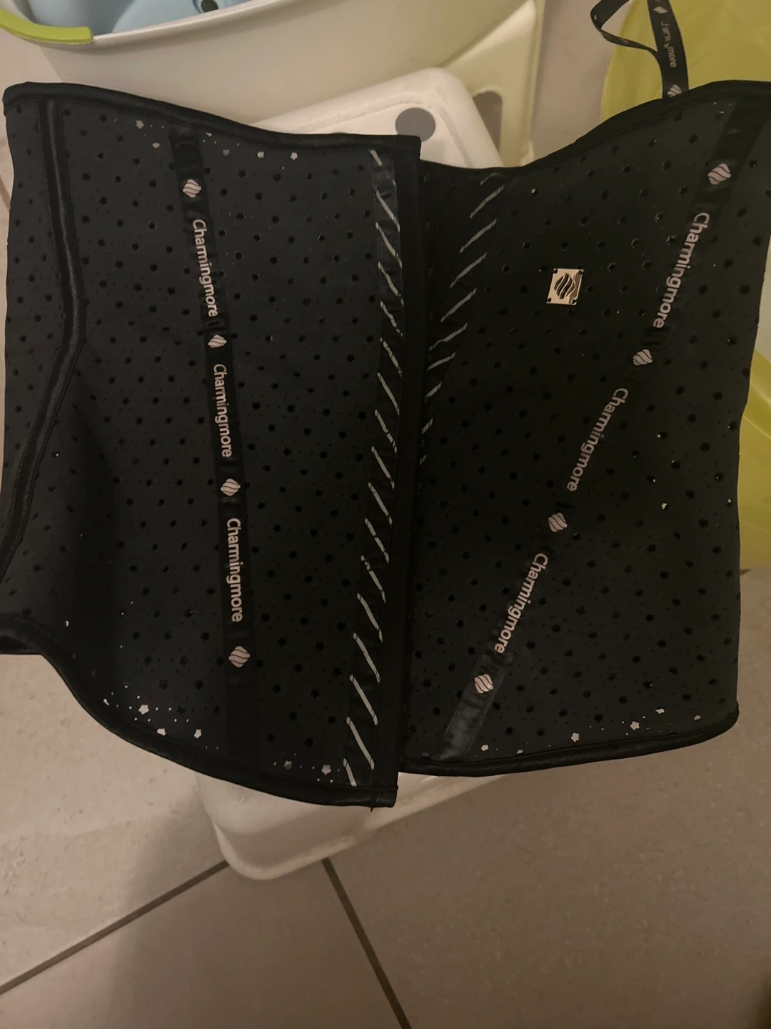 Selling a black waist trainer from Charmingmore. It has a perforated design and appears to be in good condition. Perfect for shaping and support!