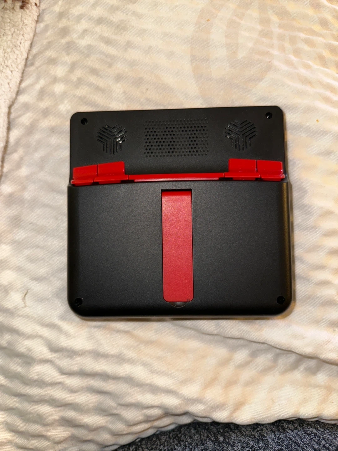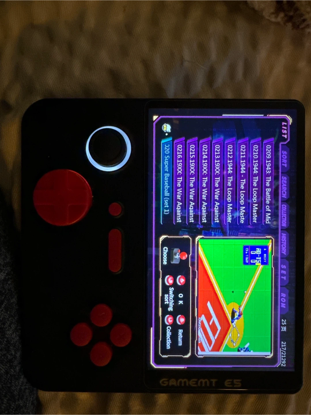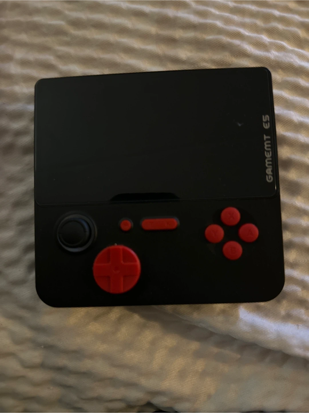 GAMEYE ES handheld game console in black. This device features a directional pad, action buttons, and a joystick. It has a screen and various ports for connectivity. Has over 2,000 games