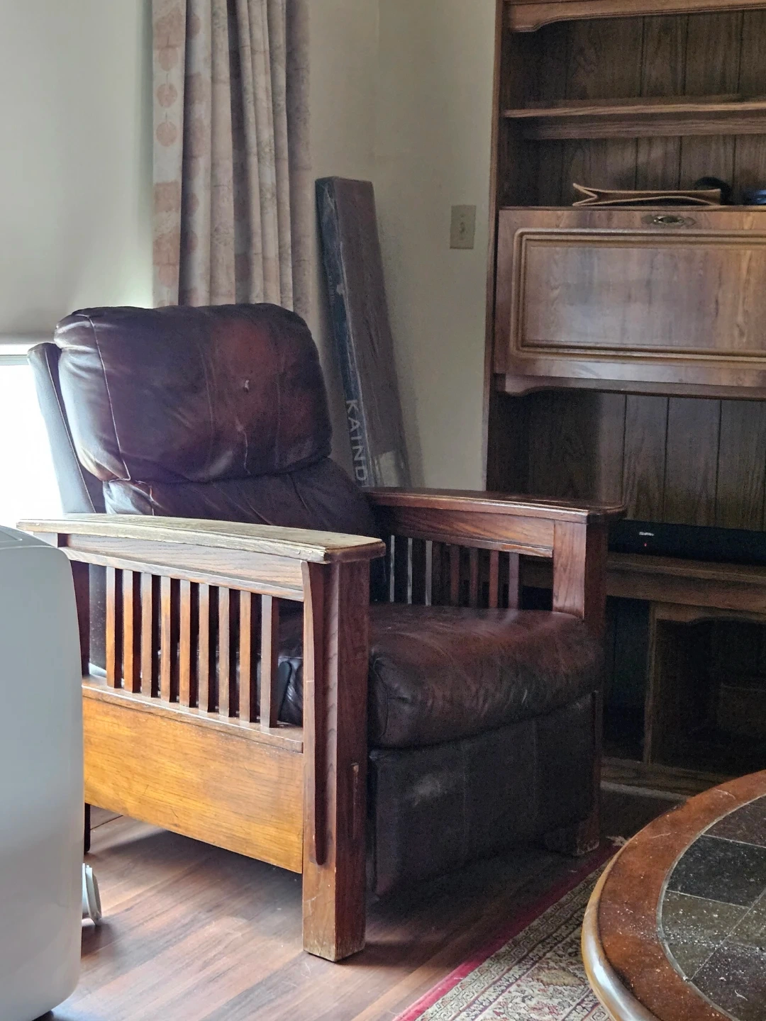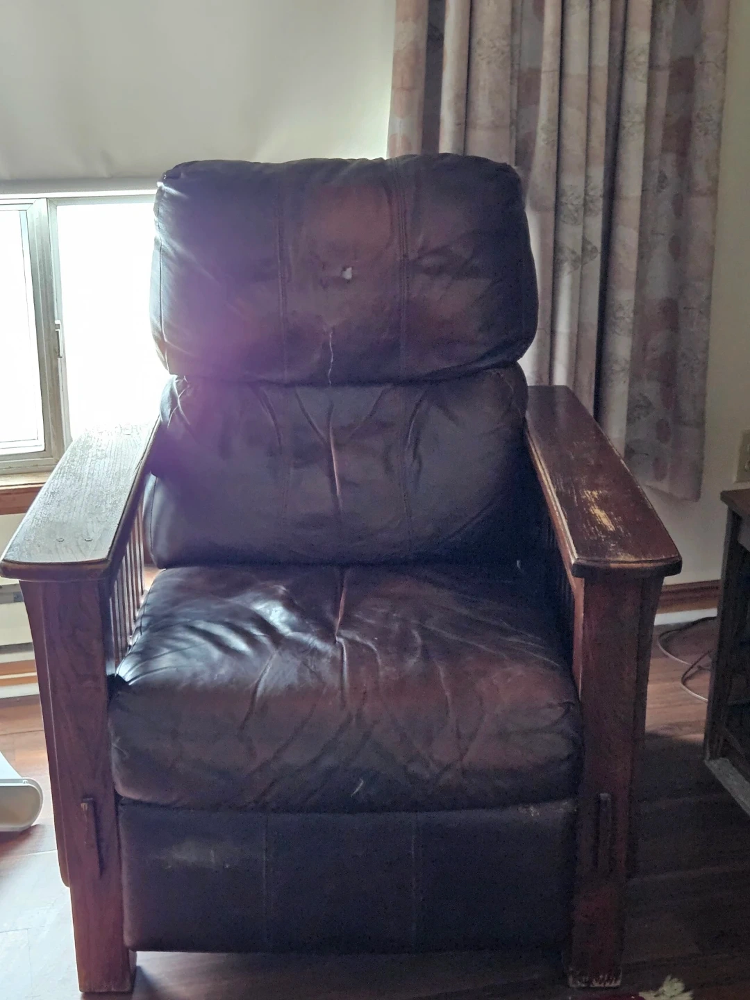Selling a comfortable leather recliner chair. It's a brown colour and shows signs of wear, as seen in the pictures. Perfect for a cozy living room or den!