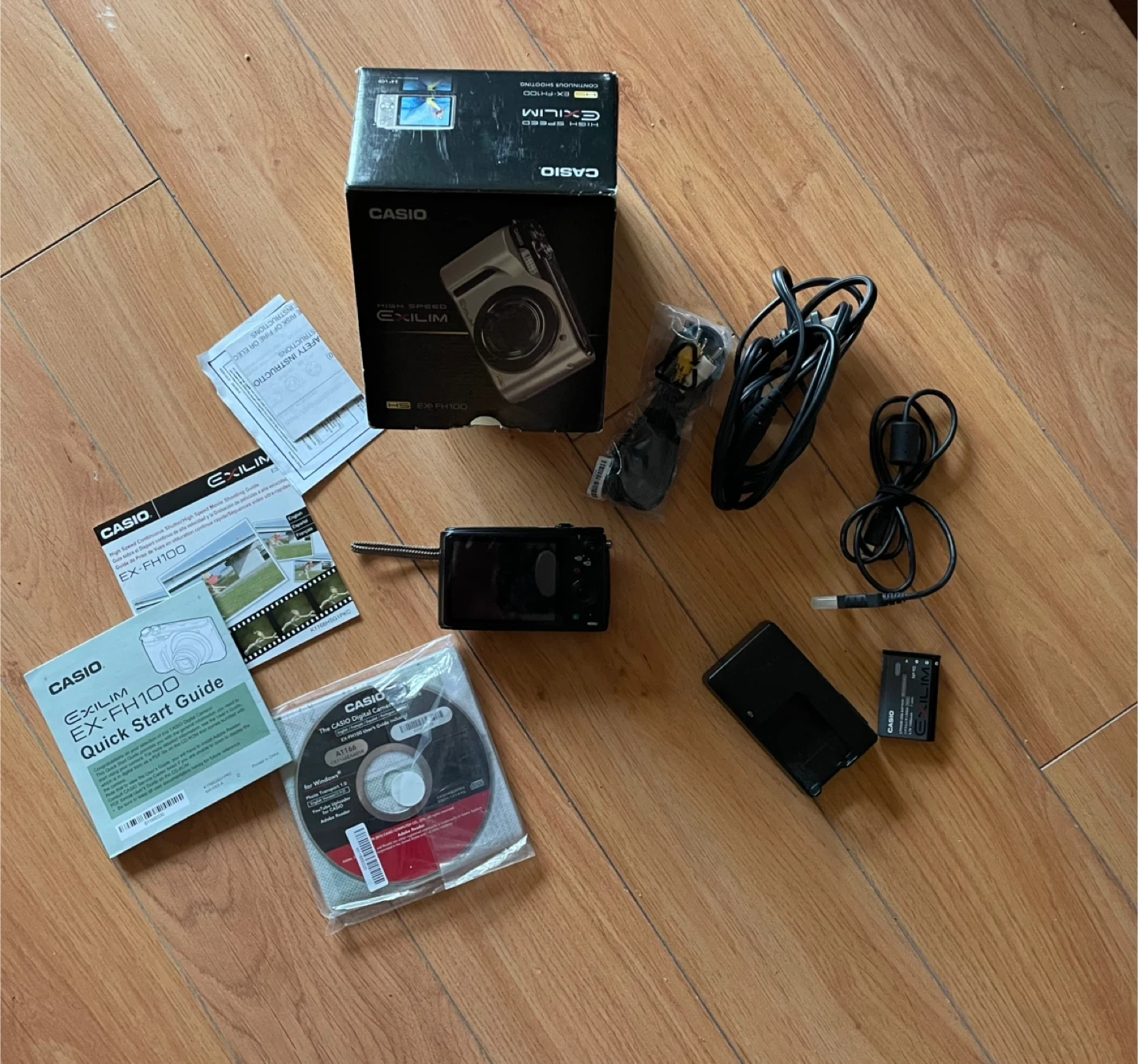 This is a Casio Exilim HS EX-FH100 digital camera. It comes with the original box, a quick start guide, instruction manual, software CD, battery, charger, and USB cable. It features a 26mm wide optical 10x zoom lens.