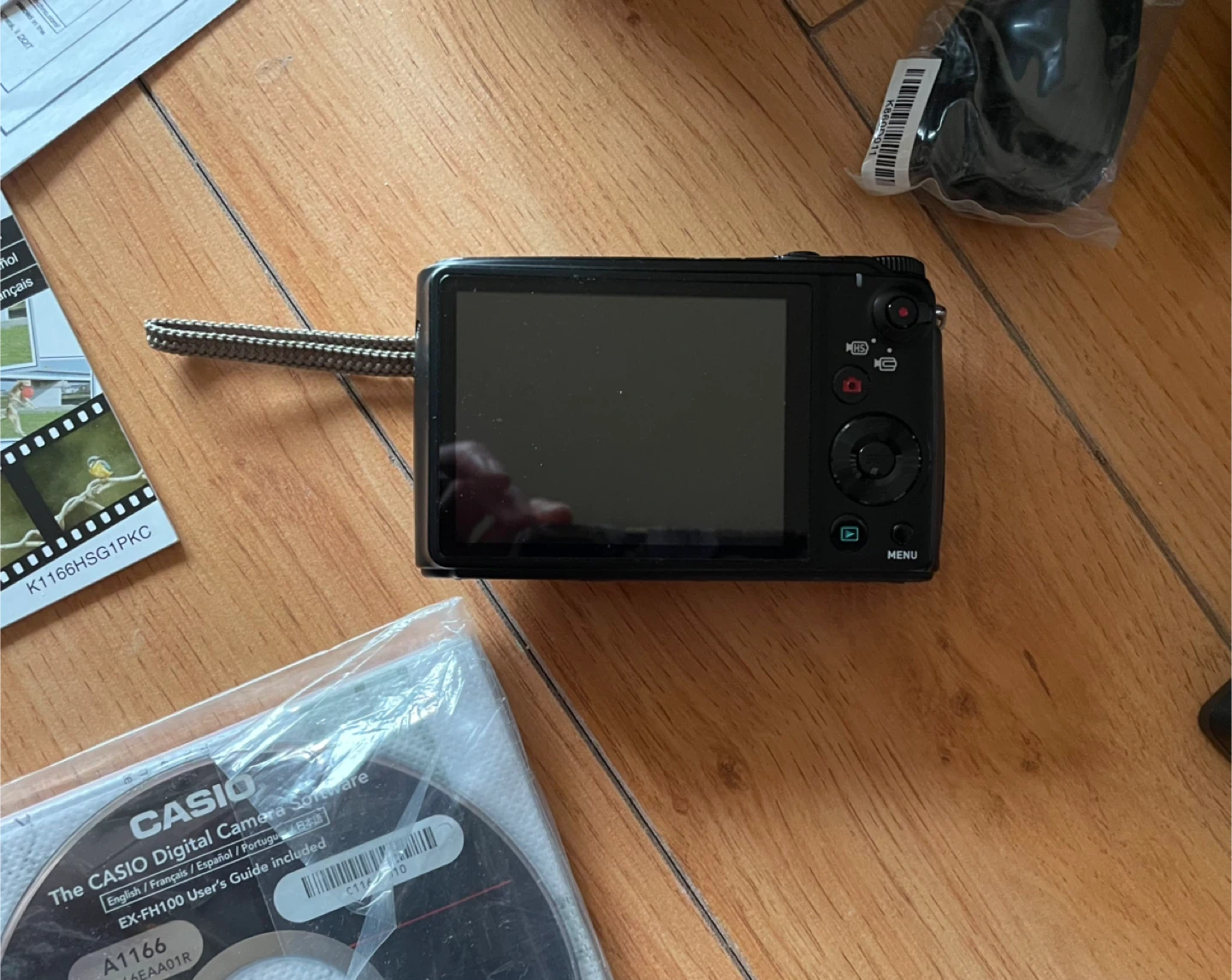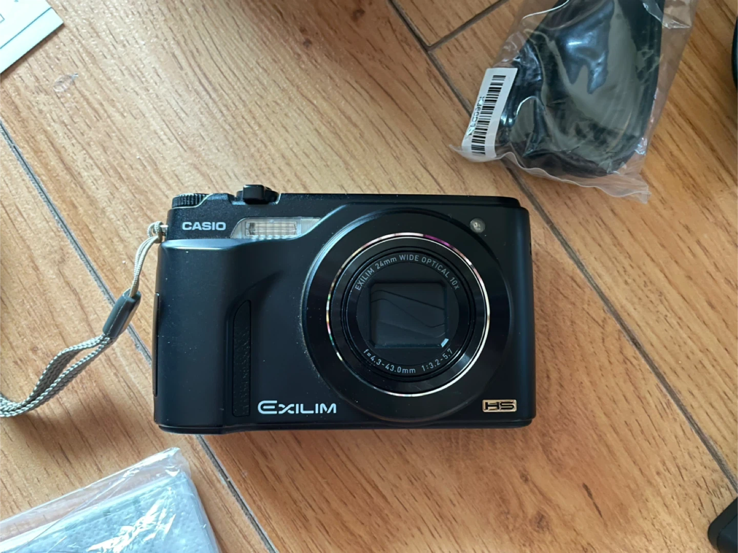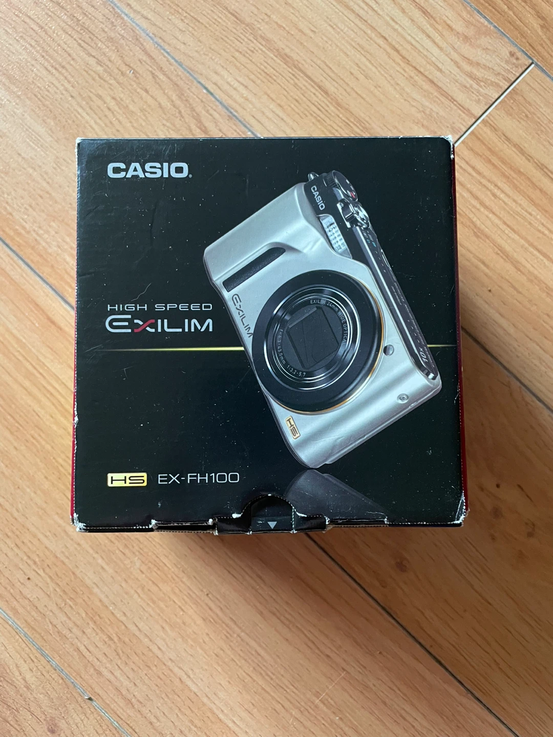 This is a Casio Exilim HS EX-FH100 digital camera. It comes with the original box, a quick start guide, instruction manual, software CD, battery, charger, and USB cable. It features a 26mm wide optical 10x zoom lens.