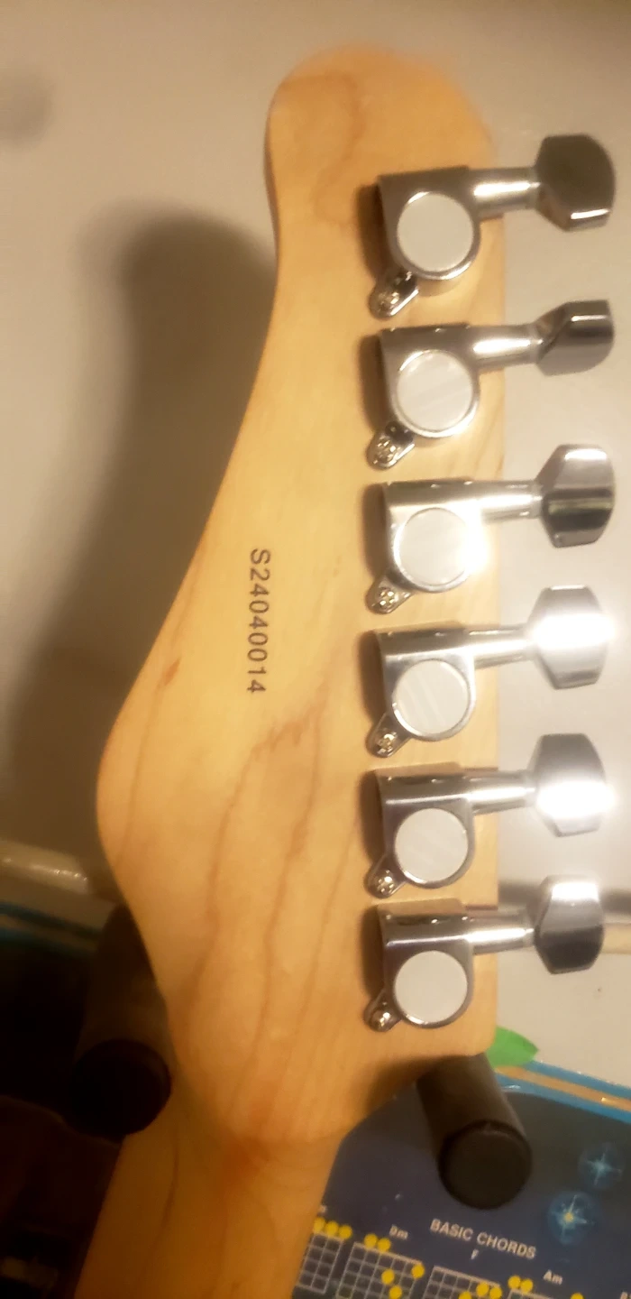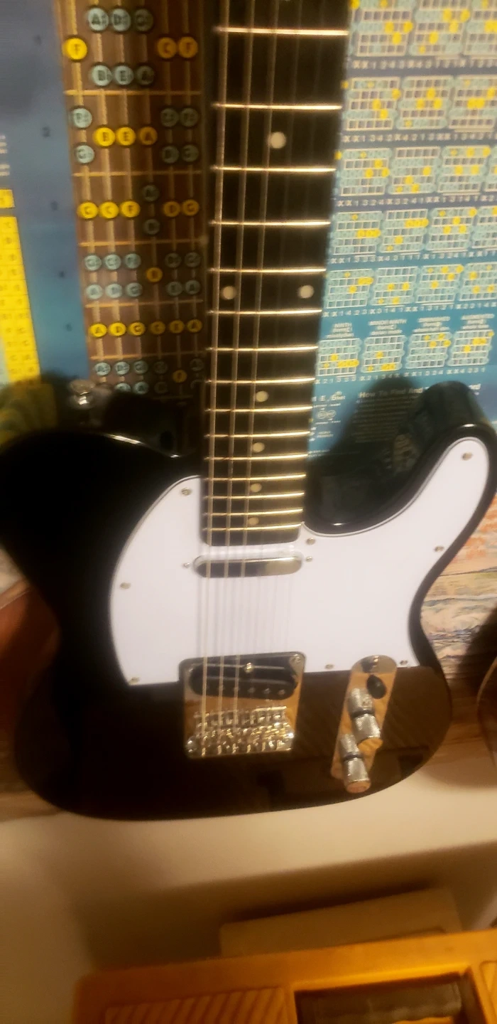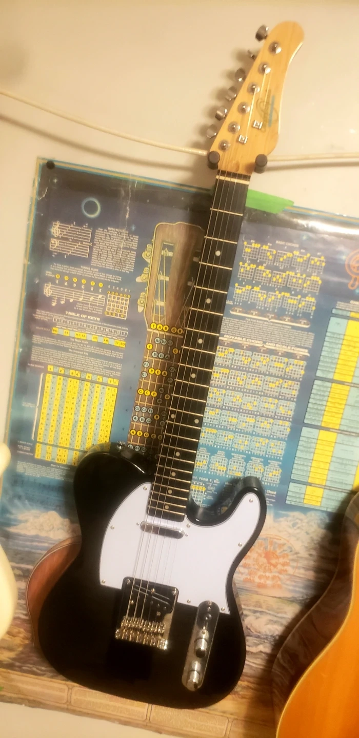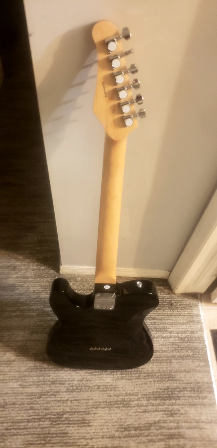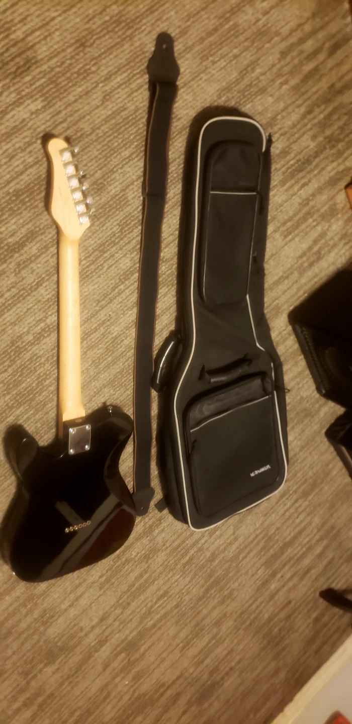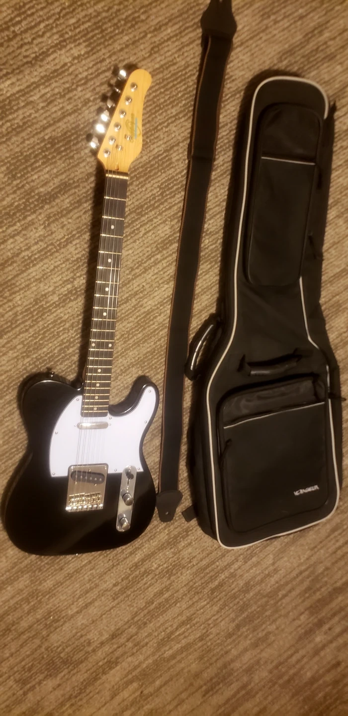 Black Washburn telecaster Style Electric guitar with a white pickguard. Includes a black gig bag and strap. Serial number S24040014 is visible on the neck.Contured Thick Alderwood Body String through ,This guitar is ready for practice or performance! New was $299.00 Usd ... location is Marlborough NE