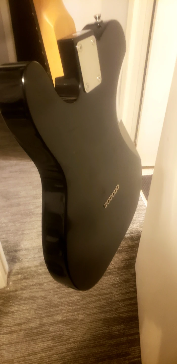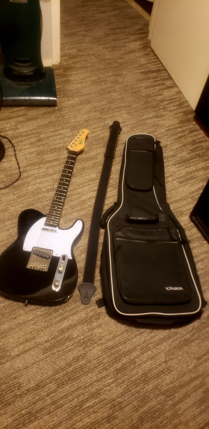 Black Washburn telecaster Style Electric guitar with a white pickguard. Includes a black gig bag and strap. Serial number S24040014 is visible on the neck.Contured Thick Alderwood Body String through ,This guitar is ready for practice or performance! New was $299.00 Usd ... location is Marlborough NE