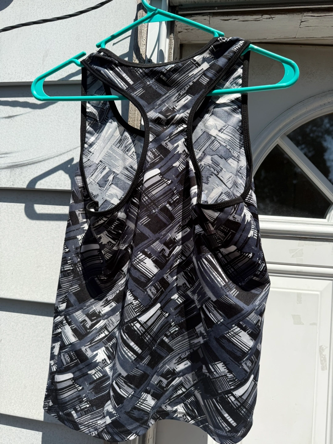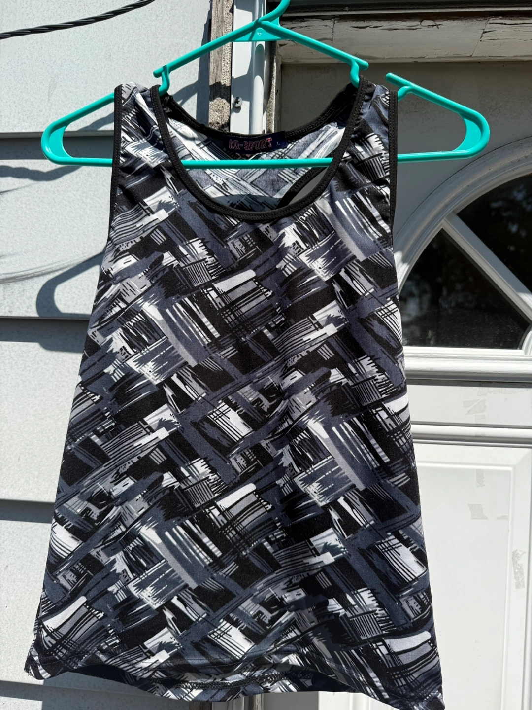 Here is an AD SPORT tank top! It's in great condition and ready for a new home. The design is a cool mix of black, white, and gray, which makes it super versatile. This tank is perfect for workouts or casual wear!