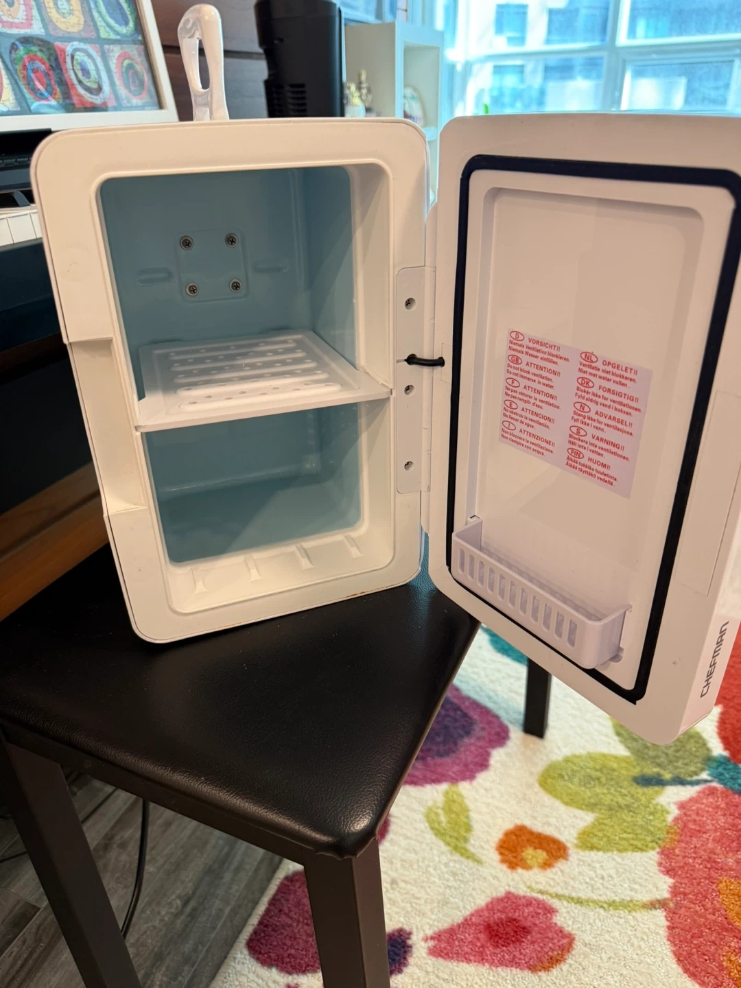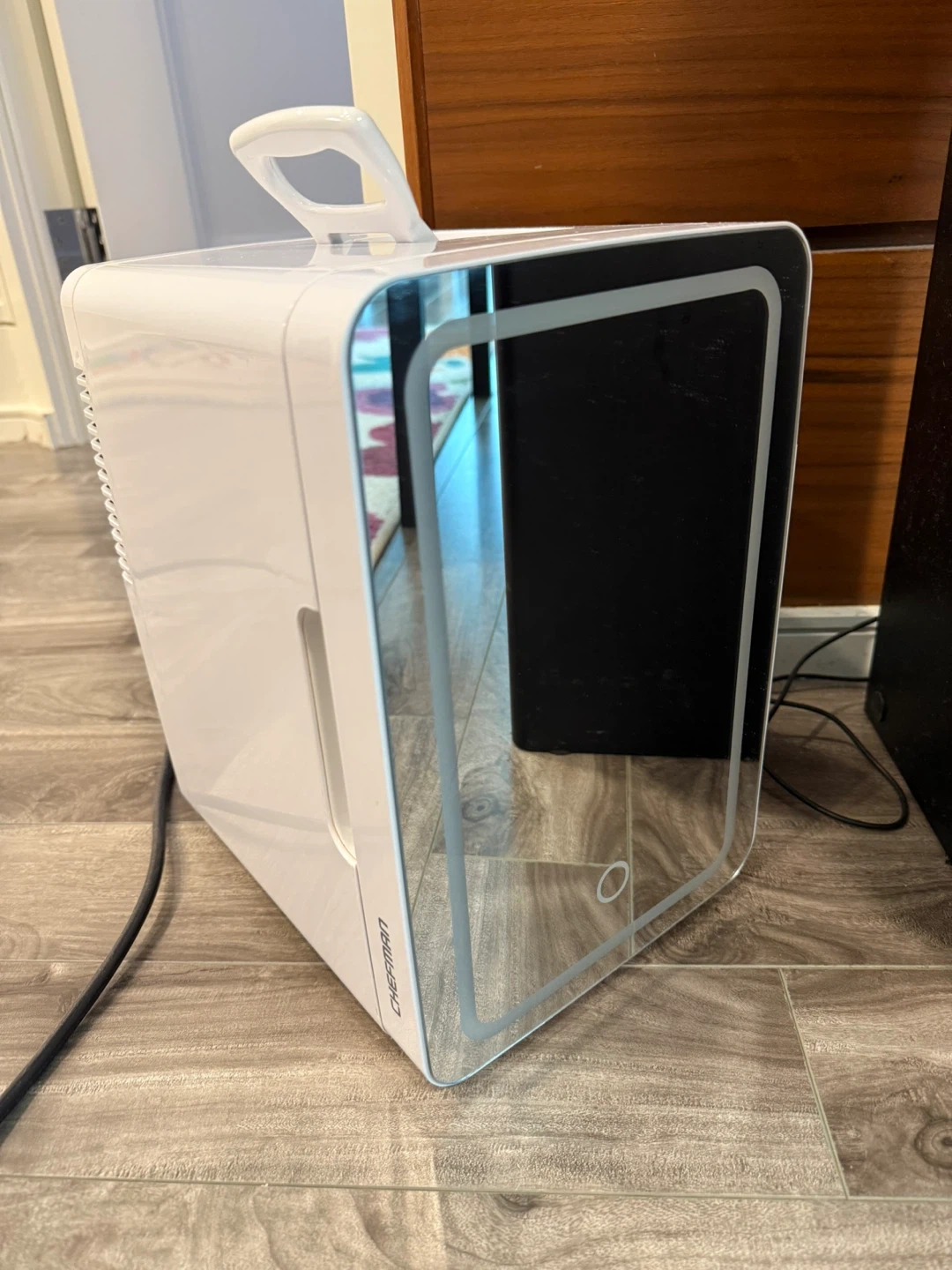 Selling a Chefman mirrored beauty fridge in white. It's perfect for keeping your skincare and makeup cool! It has a mirrored door and a convenient carrying handle. Originally bought for $79.99 USD. Used for a few months only - Like new