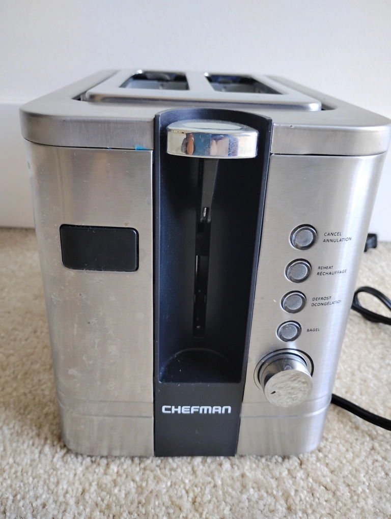60Chefman Toaster in good condition, ready for a new home! It has settings for cancel, reheat, defrost, and bagel
