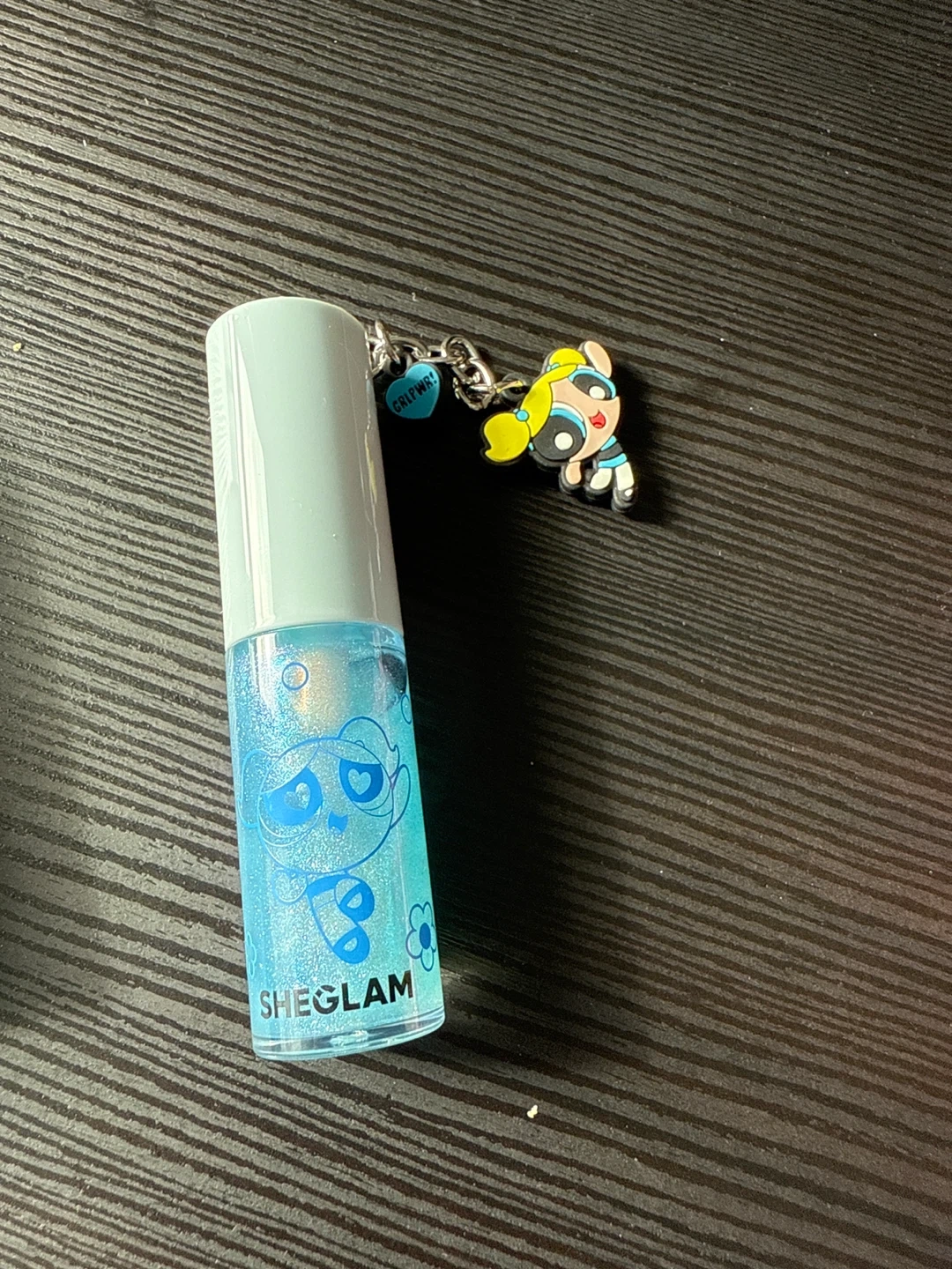 This is the "Bubbles" lip gloss from SHEGLAM's Super Trio line. It comes in a sparkling blue shade and includes a cute Powerpuff Girls charm. Net weight is 0.22 oz (6.6g).