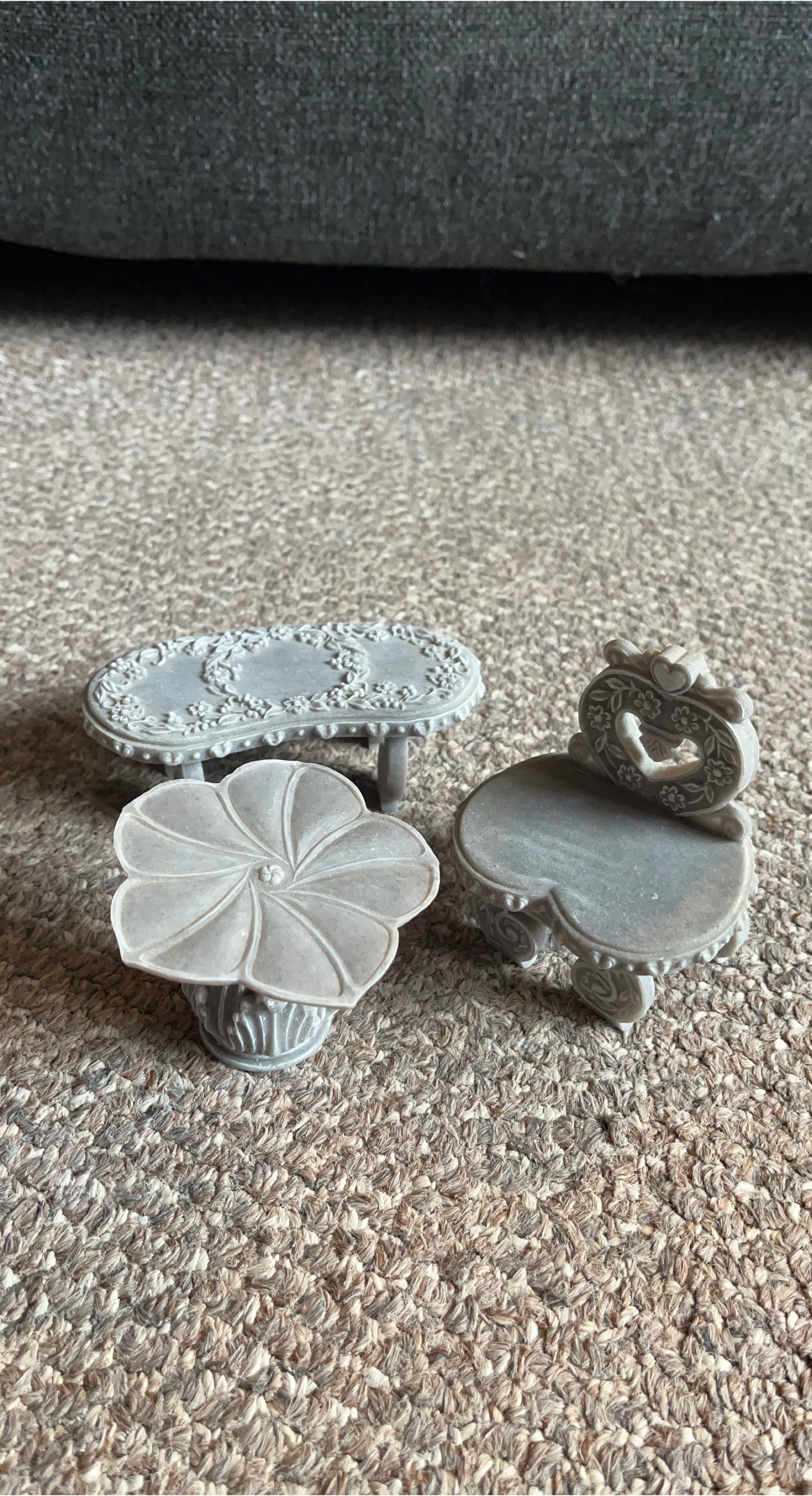 10Here's a cute miniature dollhouse furniture set! It includes a table, a flower-shaped table, and a chair. Perfect for adding a touch of charm to any dollhouse