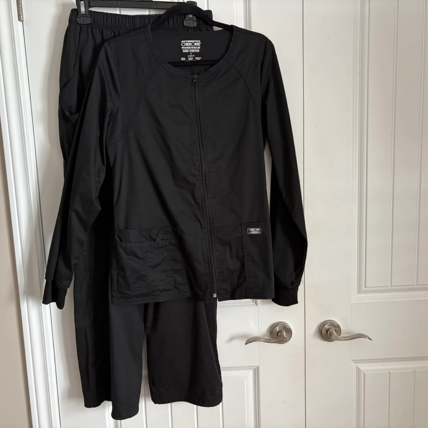 Selling a set of Cherokee Workwear scrubs in black. The set includes a zip-up jacket and pants. Both pieces are size small. Great for medical professionals or anyone needing durable work attire!