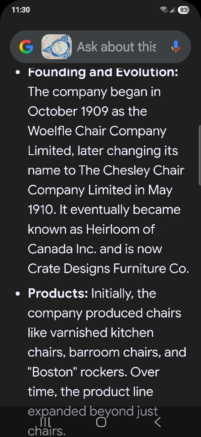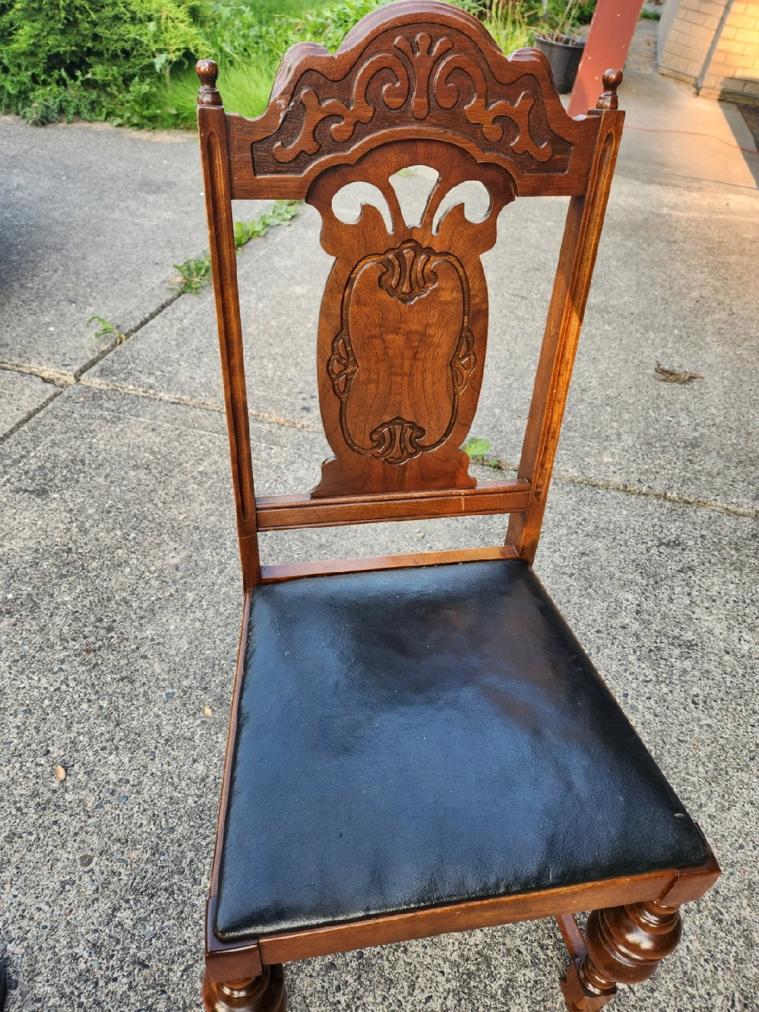 10Selling 5 beautiful antique wooden chairs from The Chesley Chair Co. Limited, Chesley, Canada. They have a unique carved design and a black leather seat. Perfect as an accent piece! $100. each.