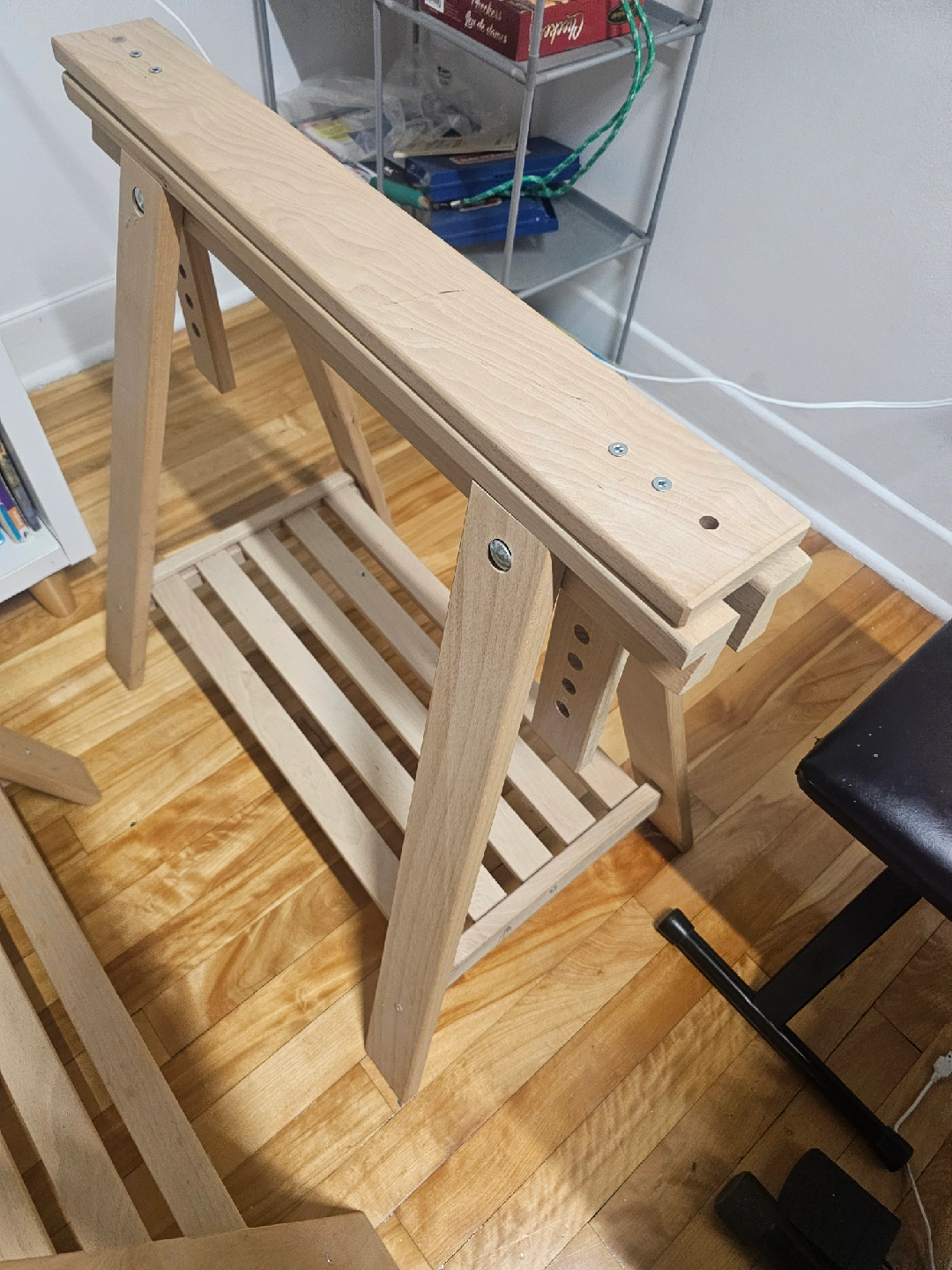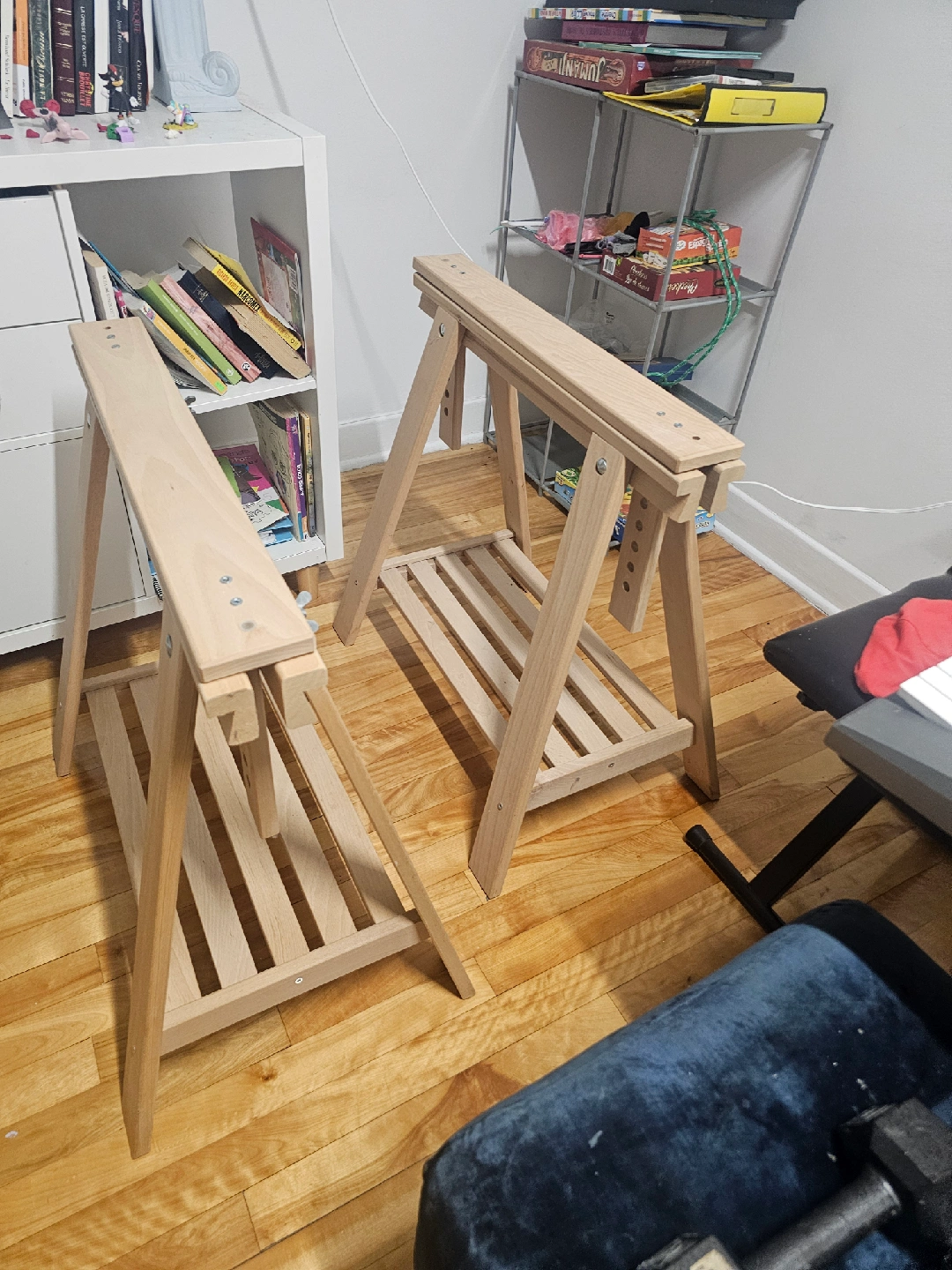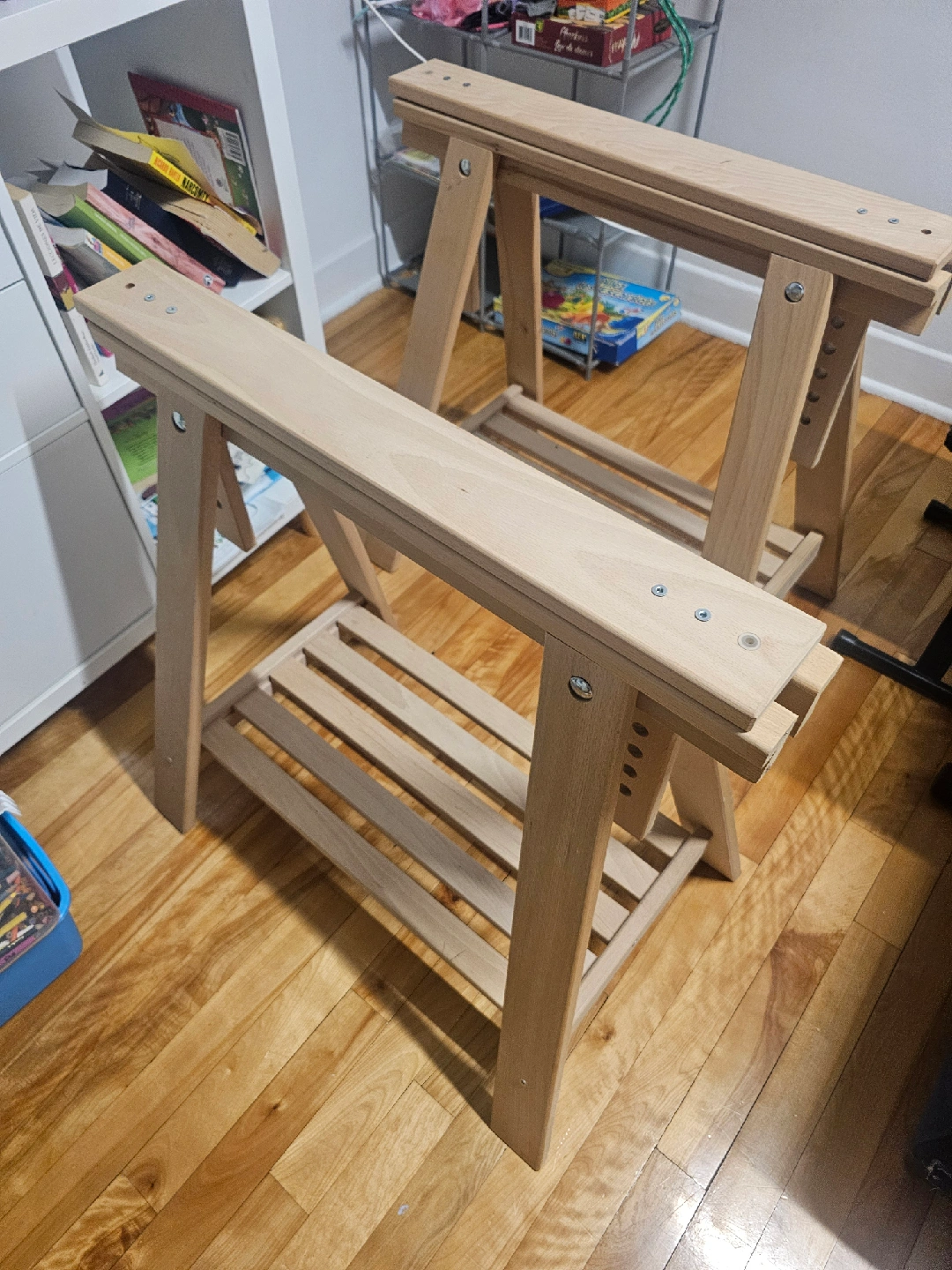 10french Je vends une paire de chevalets Finnvard avec étagères. Ils sont parfaits pour créer un bureau ou un espace de travail. Ils sont en bon état, presque neufs. Hauteur réglable .livraison possible un $ supplément englis: Selling a pair of IKEA Finnvard trestles with shelves. These are great for creating a desk or workspace. They're in good condition and ready for a new home. Sturdy and adjustable height!