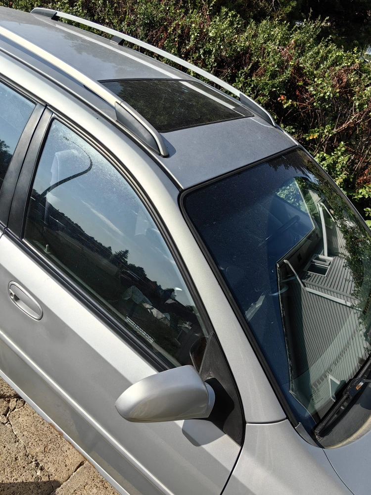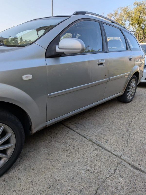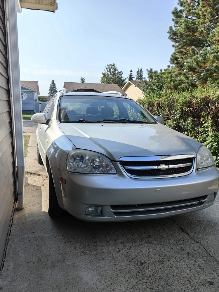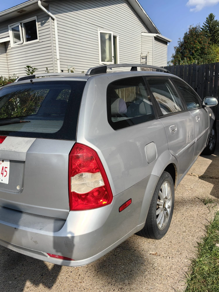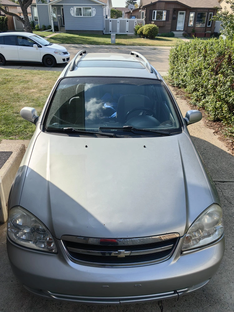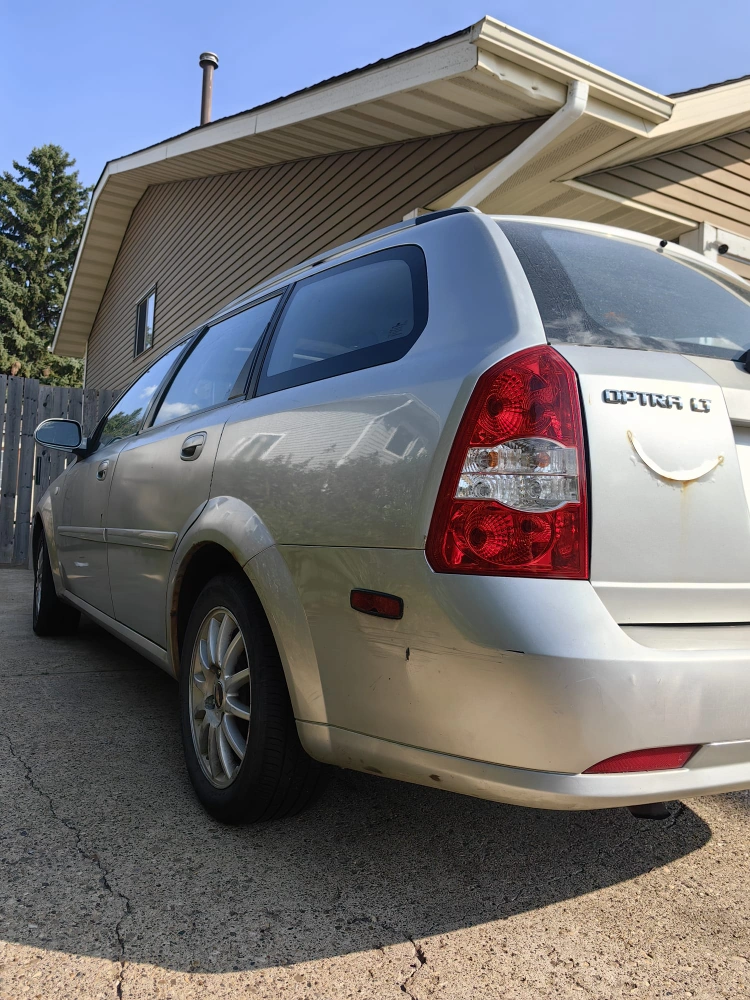 23Selling a silver Chevrolet Optra LS wagon. It has a sunroof and roof rack. The odometer reads 206965 km.