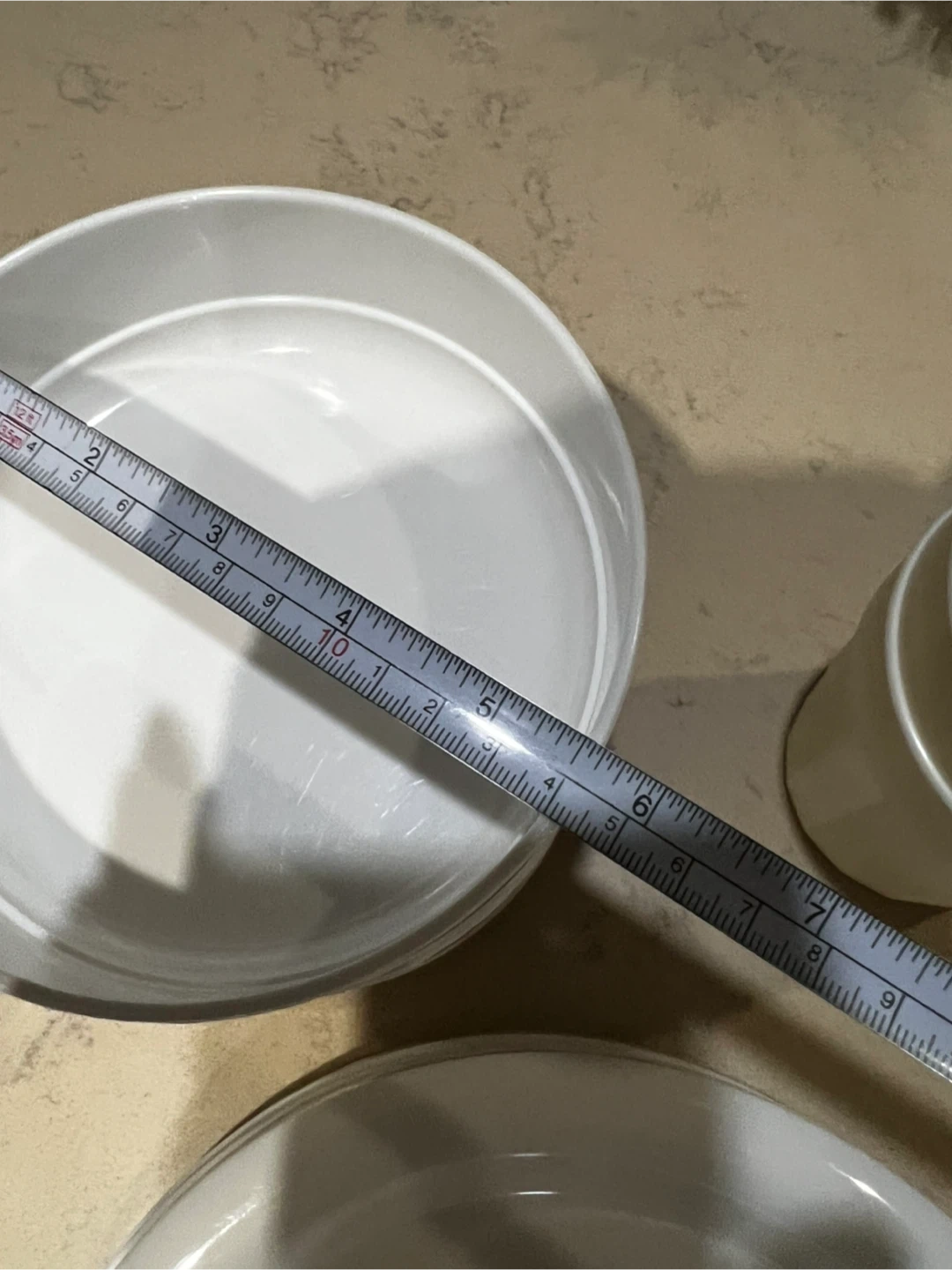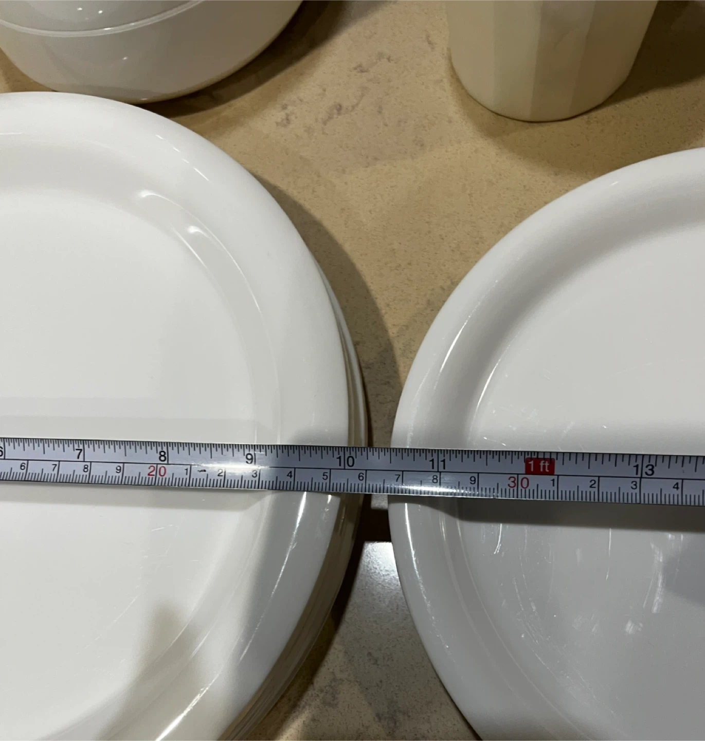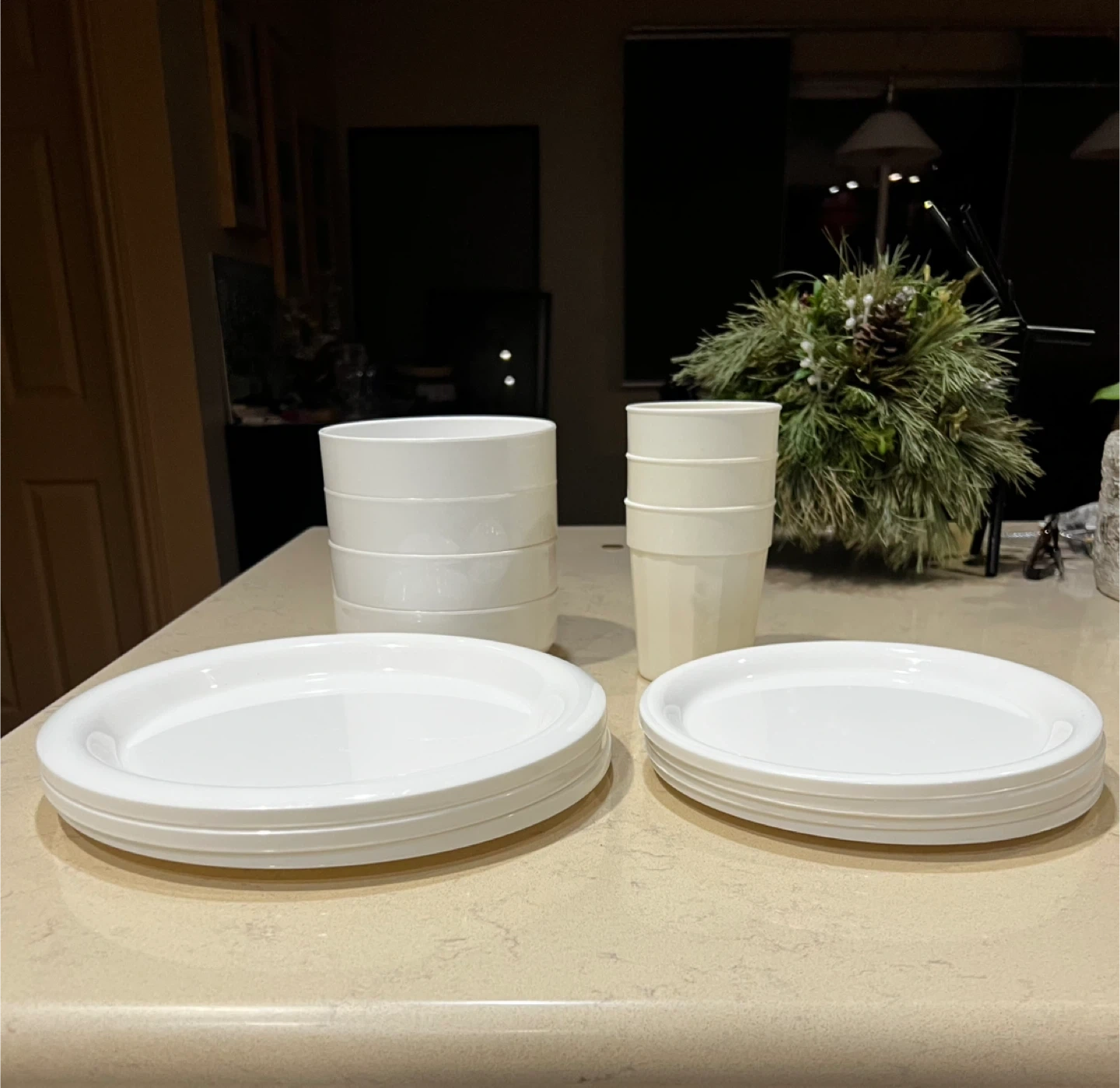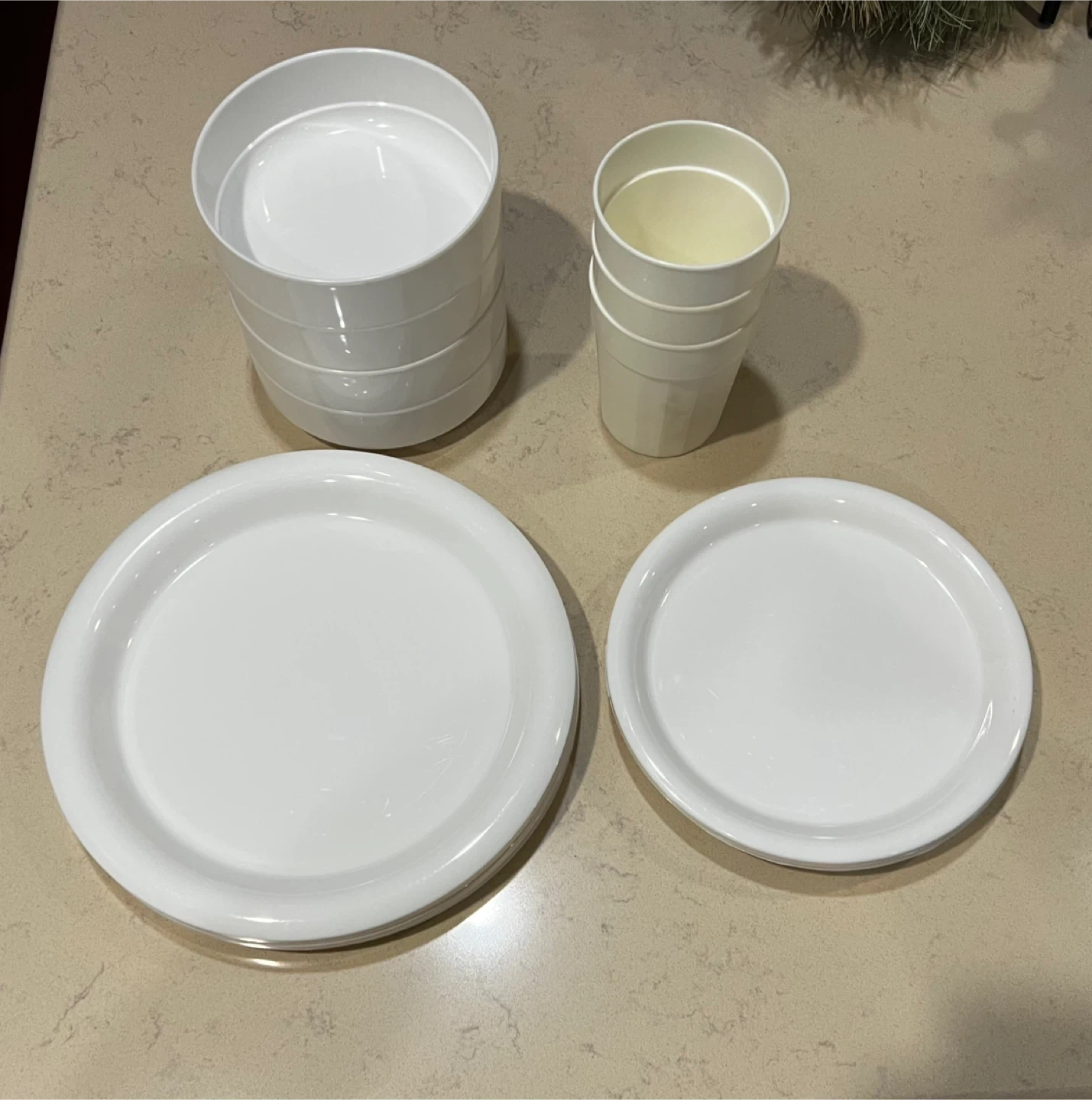 Set of reusable white melamine plates and cups.