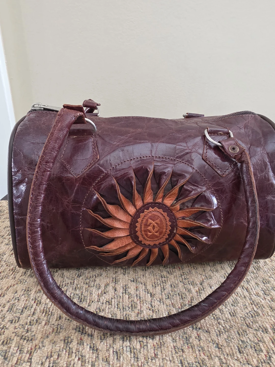 This is a unique barrel-style handbag made from textured brown leather. It features a prominent, handcrafted sunflower applique on the front. The bag has a zippered closure and dual top handles. Interior shows a zippered pocket.
