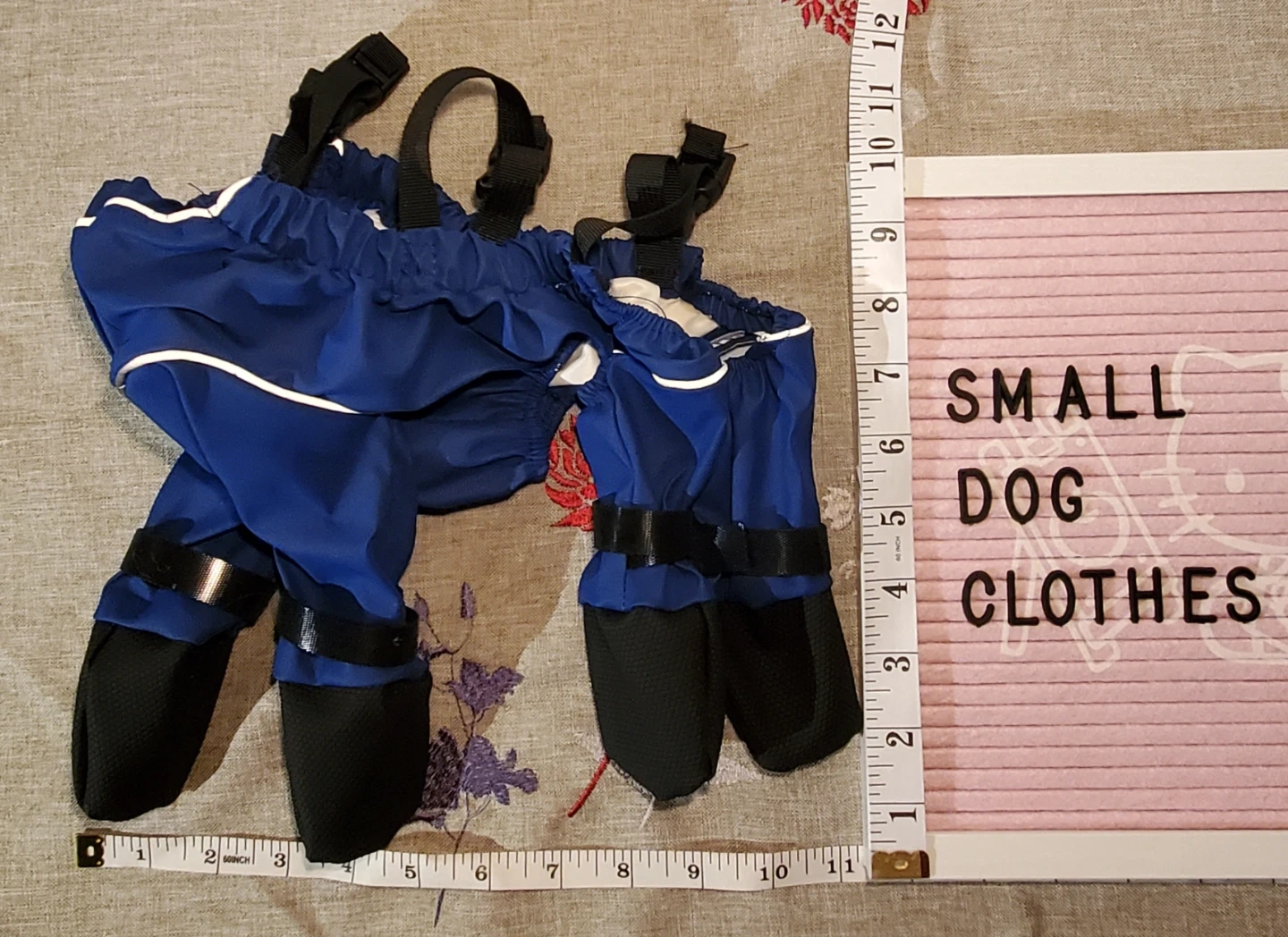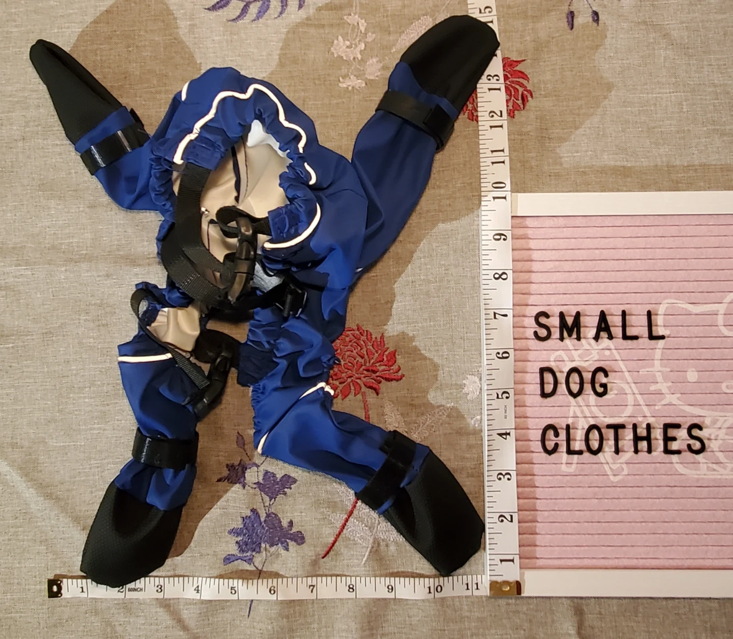 This S navy blue dog snowsuit features integrated boots for full coverage. It's designed for small dogs and has adjustable straps for a secure fit. Reflective trim for visibility.