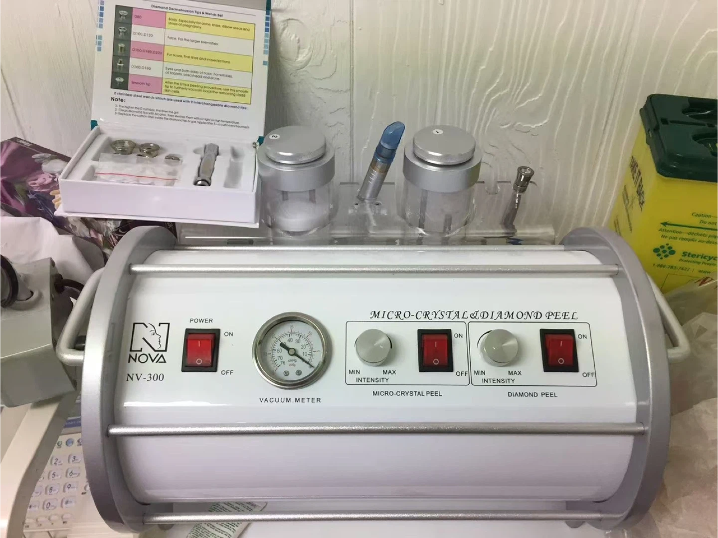 This Nova NV-300 machine offers both micro-crystal and diamond peel functionalities. It includes adjustable intensity settings for precise treatment. It also features a vacuum meter for monitoring suction levels during use.