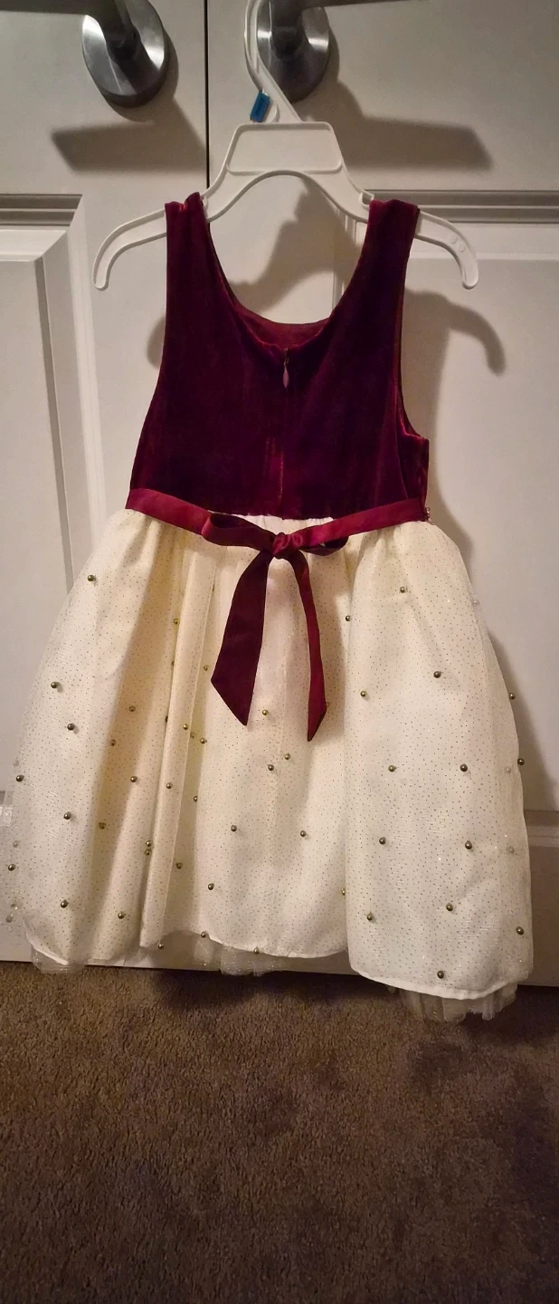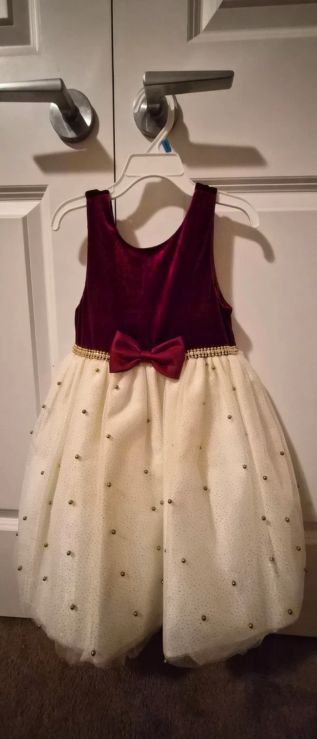 Beautiful girls' party dress featuring a burgundy velvet bodice and a cream tulle skirt adorned with gold glitter and beads. It has a satin bow accent on the front and a tie in the back. This dress is perfect for special occasions! (4-6 and 6-8 years old)