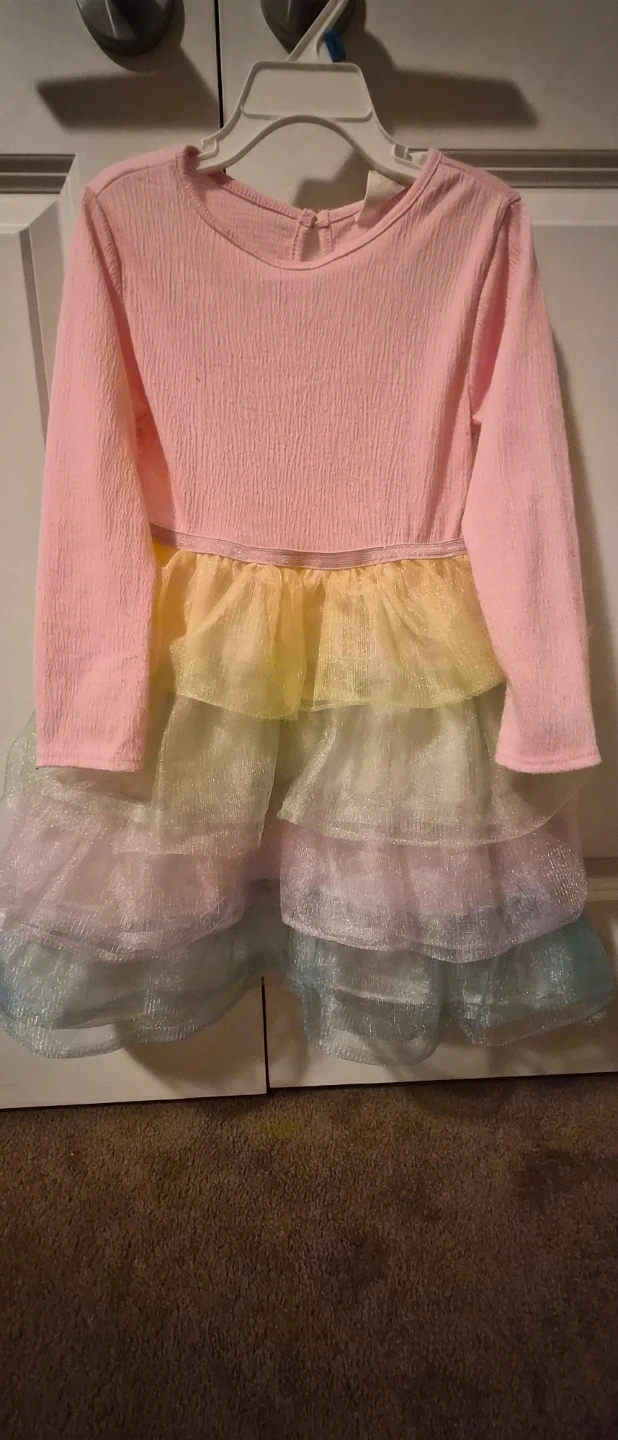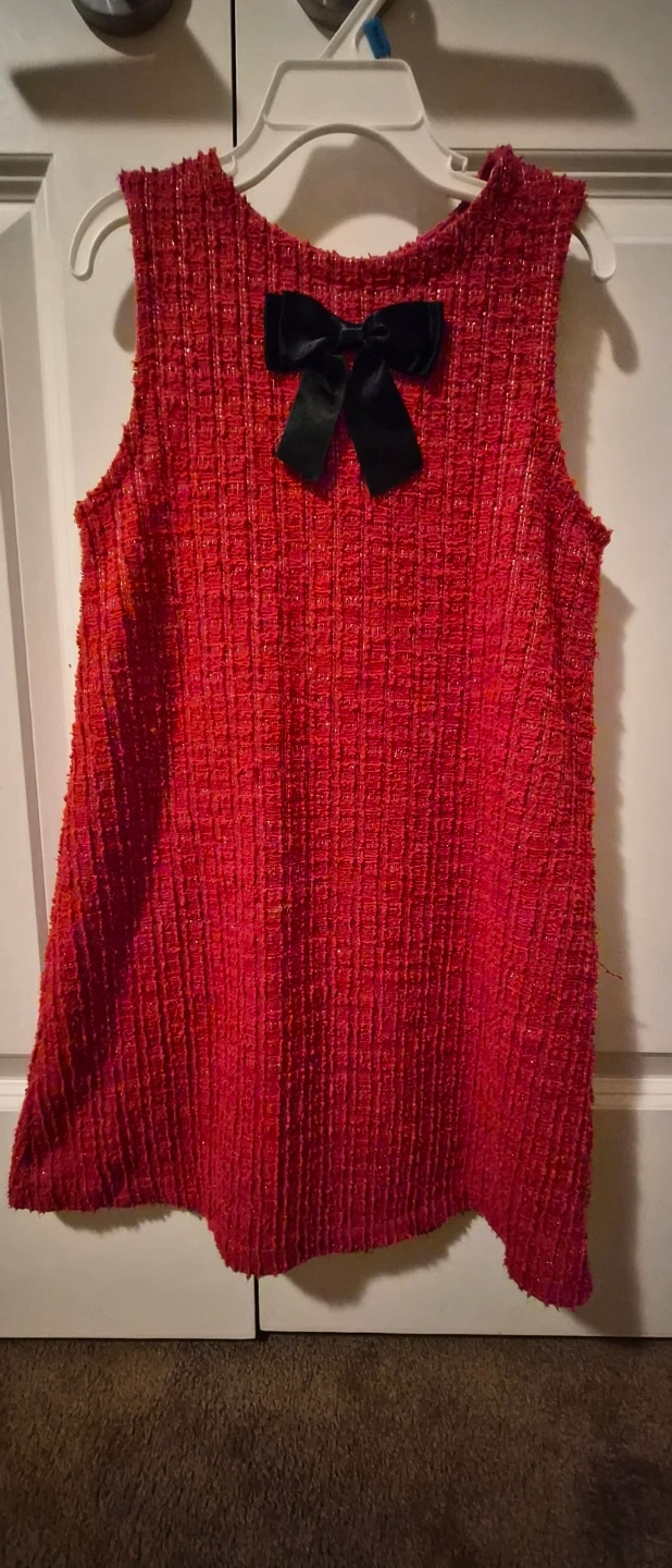 Beautiful girls' party dress featuring a burgundy velvet bodice and a cream tulle skirt adorned with gold glitter and beads. It has a satin bow accent on the front and a tie in the back. This dress is perfect for special occasions! (4-6 and 6-8 years old)