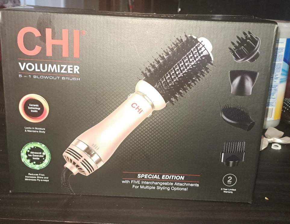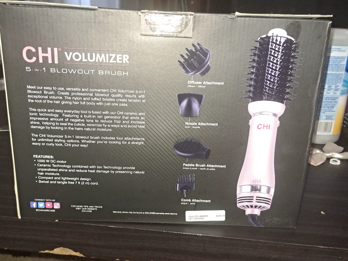 15Selling a CHI Volumizer 5-in-1 Blowout Brush! This special edition comes with five interchangeable attachments for multiple styling options. It features ceramic technology combined with Ion Technology to provide unsurpassed shine and reduce heat damage by preserving natural hair moisture. It also has a 1000 W DC motor and a swivel and tangle free 7 ft (2 m) cord. Box included!