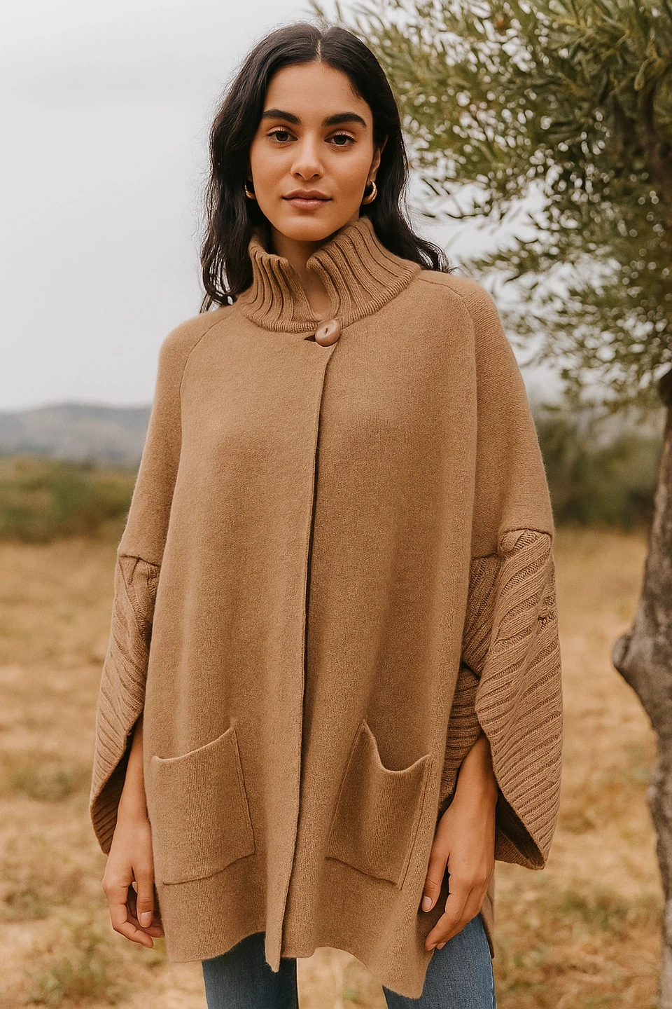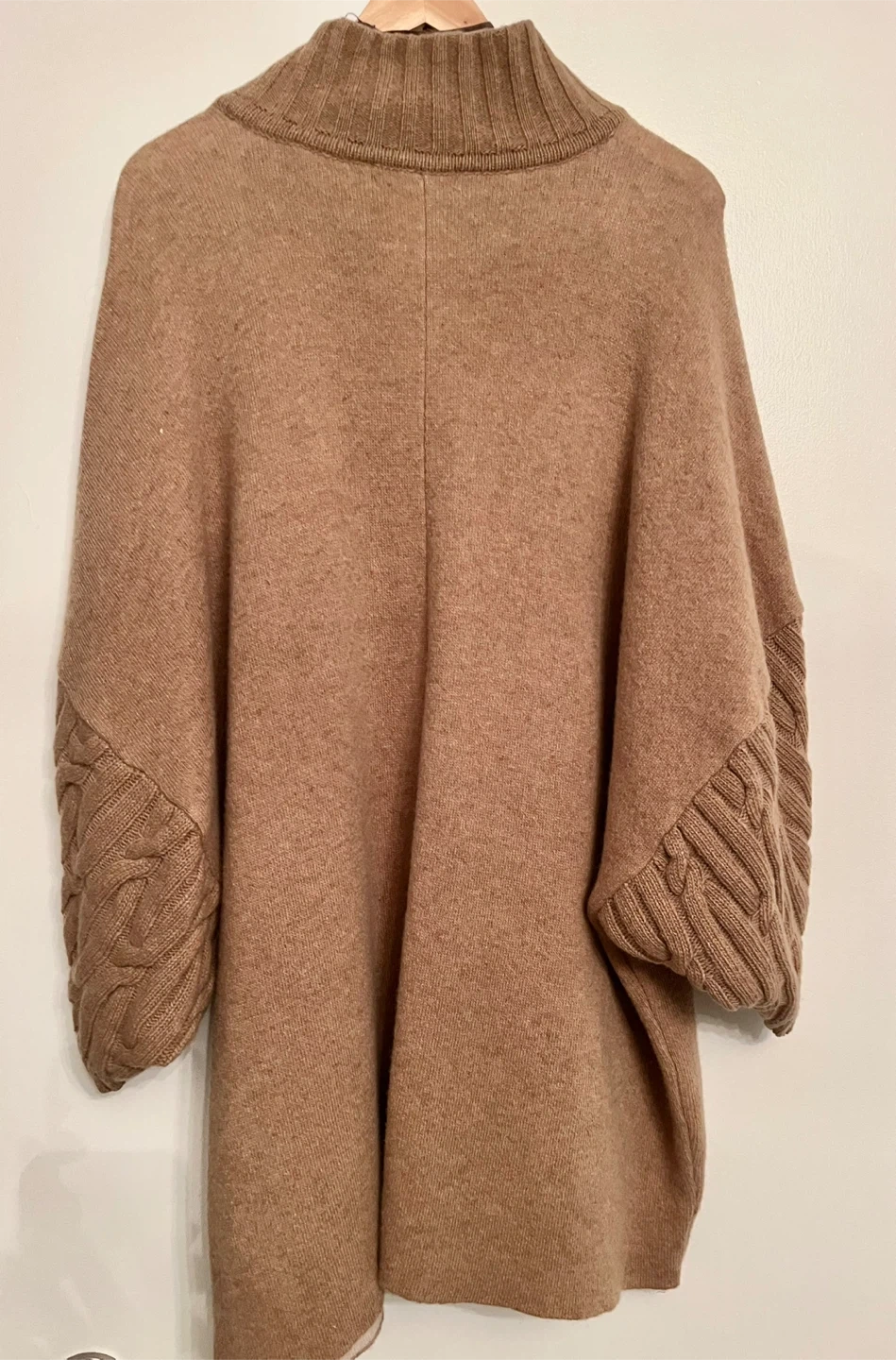 852Cozy up in this Chiaramente cape! It's an XL/TG and made in Italy. The material is a blend of 66% wool, 28% nylon/polyamide, and other fibres. It works for a medium too for an oversized look.