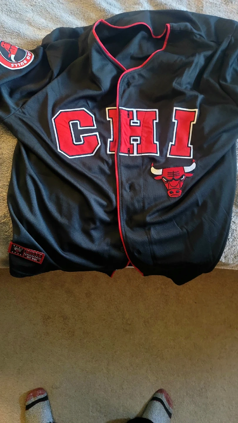 14Selling a Chicago Bulls baseball jersey! It's black with red and white accents, featuring the iconic Bulls logo. The jersey is in great condition and ready for a new fan!