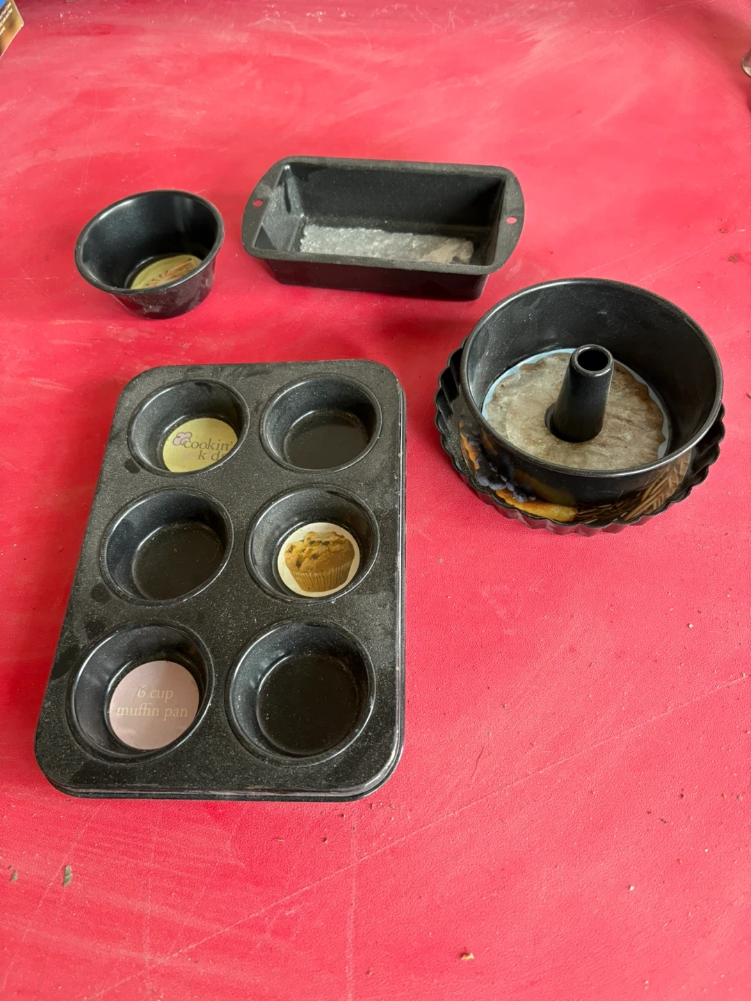73Child sized to bake with your parents. Selling a collection of baking pans! Includes a bundt pan, a loaf pan, a muffin pan and a small round pan.