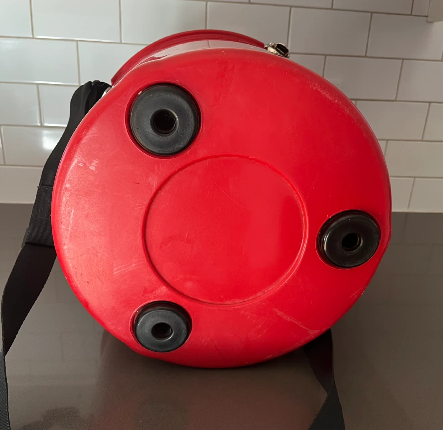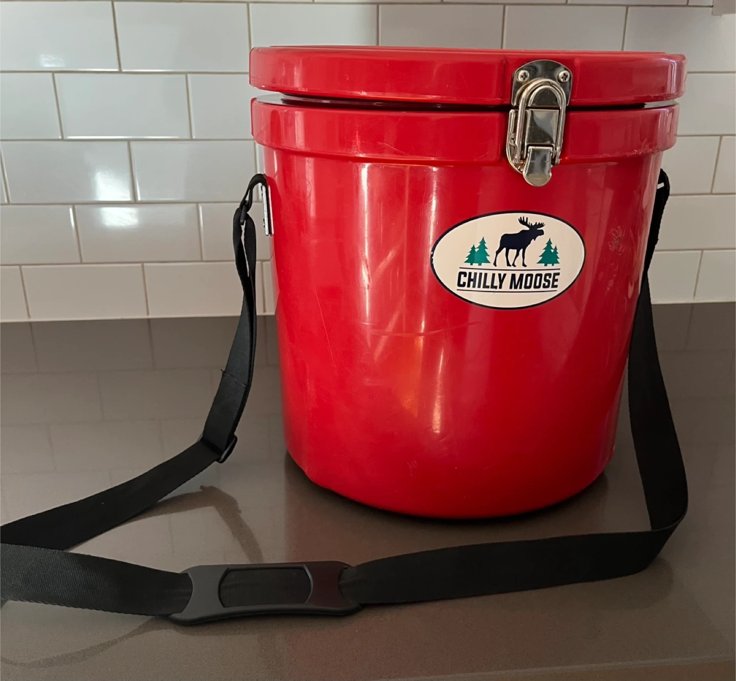 41Red Chilly Moose cooler with a shoulder strap. It has a few scratches but is still in good condition and ready to keep your drinks cool!