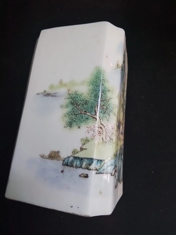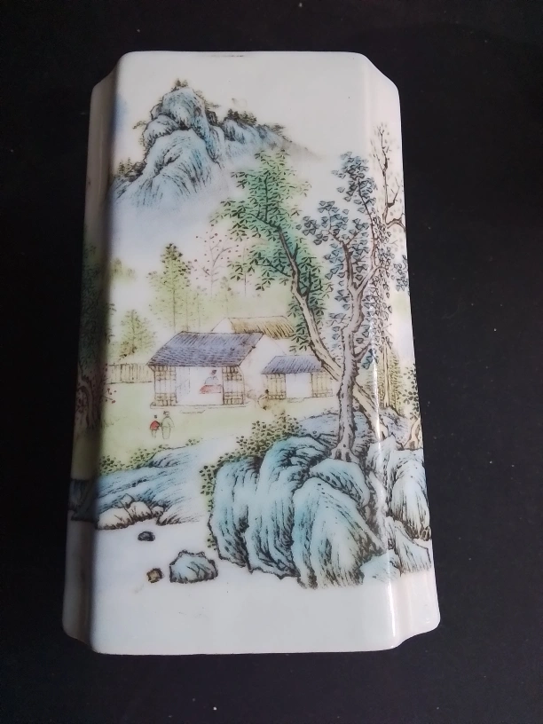 114Chinese Famille Rose Porcelain Brush Pot with Mark Chinese famille rose porcelain brush pot. Featuring square form body. Painted with mountainous landscape and house. Chinese calligraphy on side with artist's mark; three-character "Xi Xi Lu" on base; 12 cm x 7.5 cm, 414 grams Unique porcelain vase. Features a beautiful hand-painted landscape scene. Octagonal shape. Small size. Ideal for displaying small flowers or as a decorative piece. Estimate 150.00 - 300.00 USD Pickup at Young Street and Steels Ave