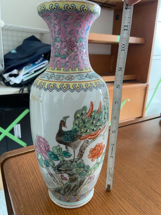 This striking peacock vase is a lovely piece that stands approximately 11 inches tall, perfect for adding an elegant touch to any room. It's a unique decorative item that would make a great addition to any collection. This vase is in good condition, showcasing vibrant colours and intricate details. It's a pre-loved item that has been well-maintained. * Elegant design * Peacock motif * Height: Approximately 11 inches