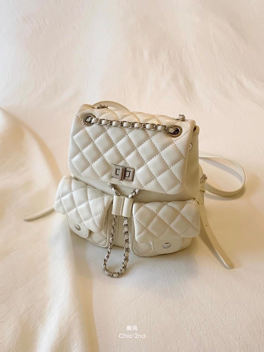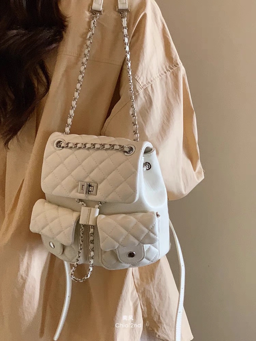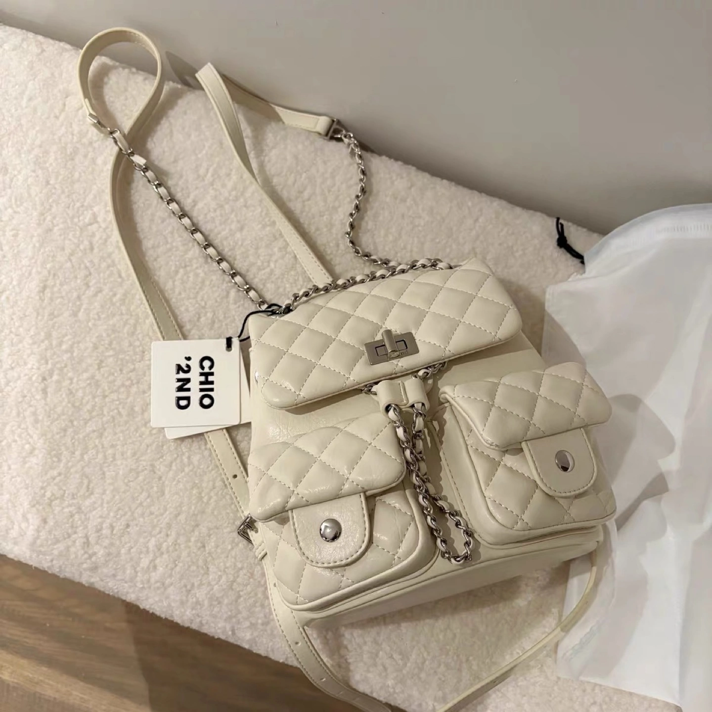 This is a stylish white quilted backpack from Chio'2nd! It features a unique design with chain detailing and multiple pockets. Perfect for adding a chic touch to your everyday look!