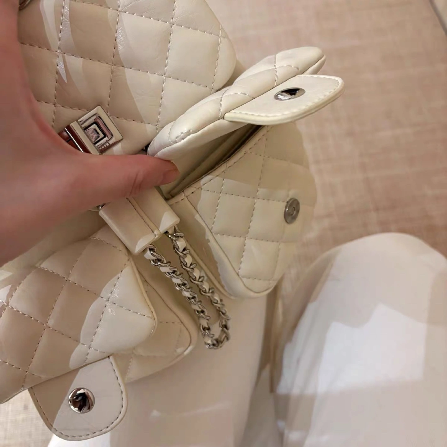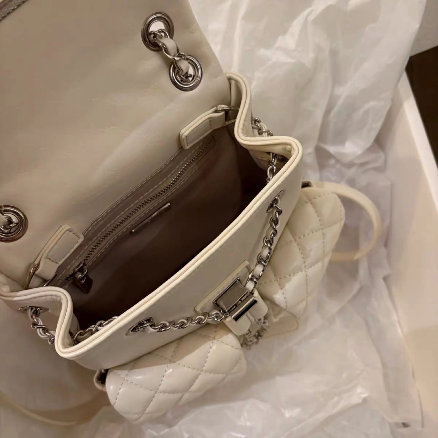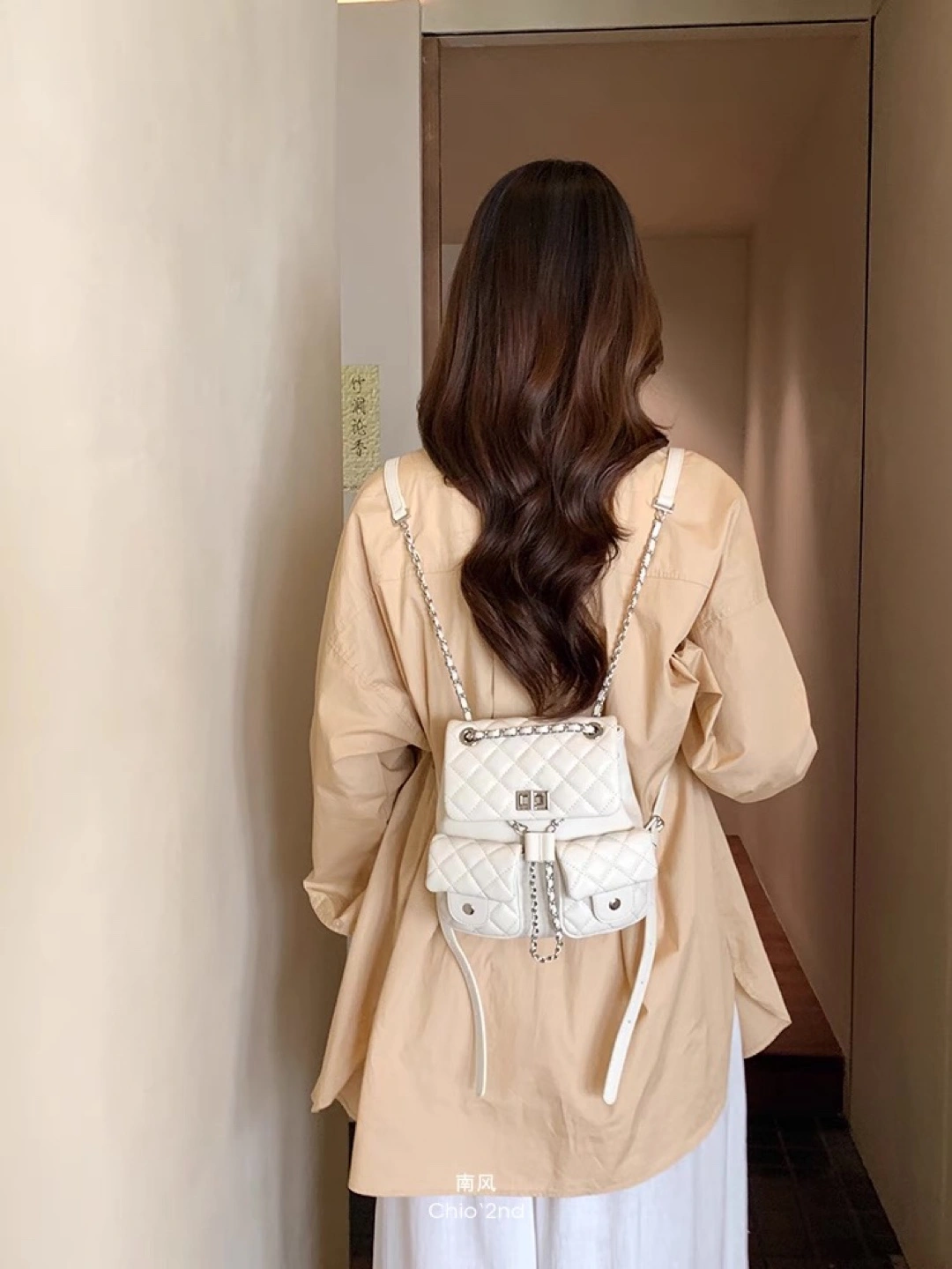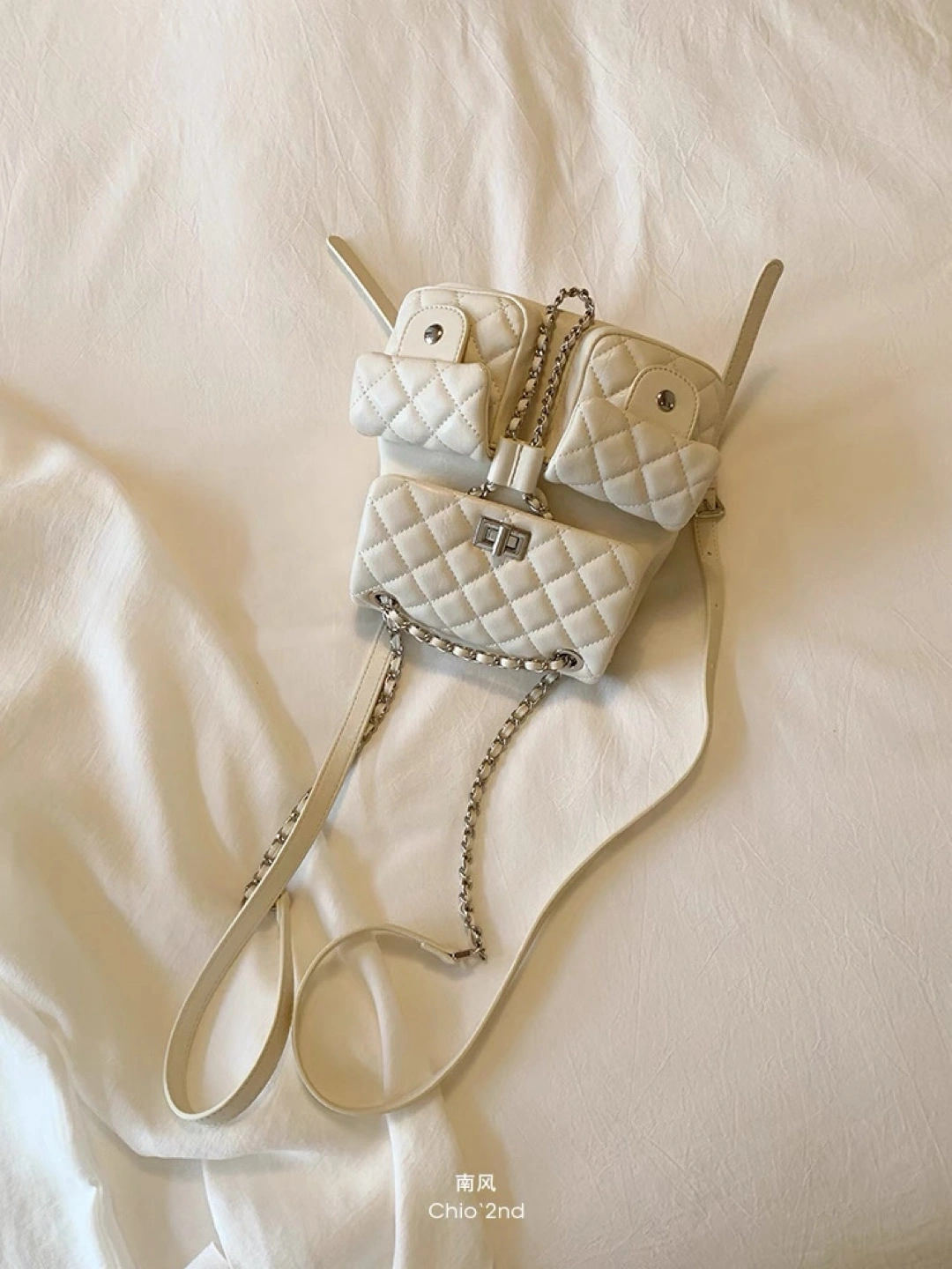 This is a stylish white quilted backpack from Chio'2nd! It features a unique design with chain detailing and multiple pockets. Perfect for adding a chic touch to your everyday look!