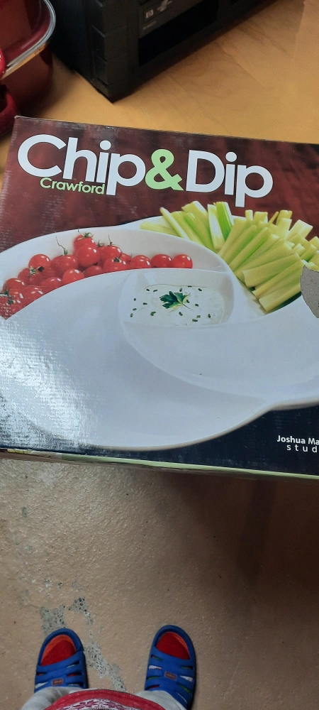 80White ceramic serving platter with four sections. Great for serving chips and dip or other snacks.