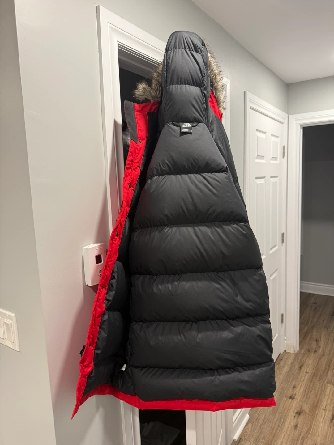 This is The North Face men's parka jacket in a size large. It's a bold red and black colourway with a faux fur-lined hood. Keeps you warm during chilly weather!