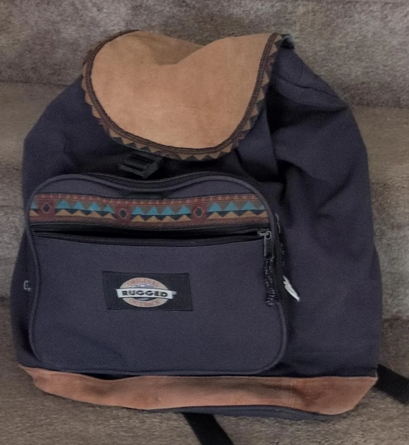 This is a blue backpack with tan suede accents and a decorative woven band. It has a front zip pocket and a main compartment. Suede bottom.
