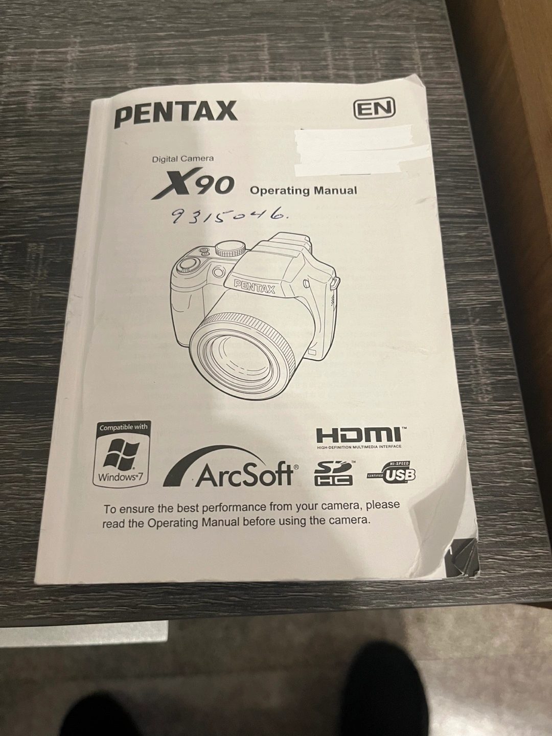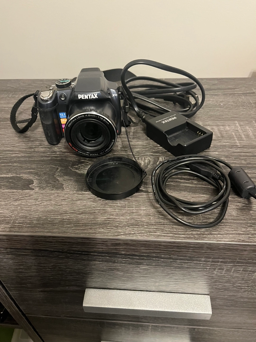Pentax X90 digital camera. Comes complete with manual, charger, cable for downloading and bag.
